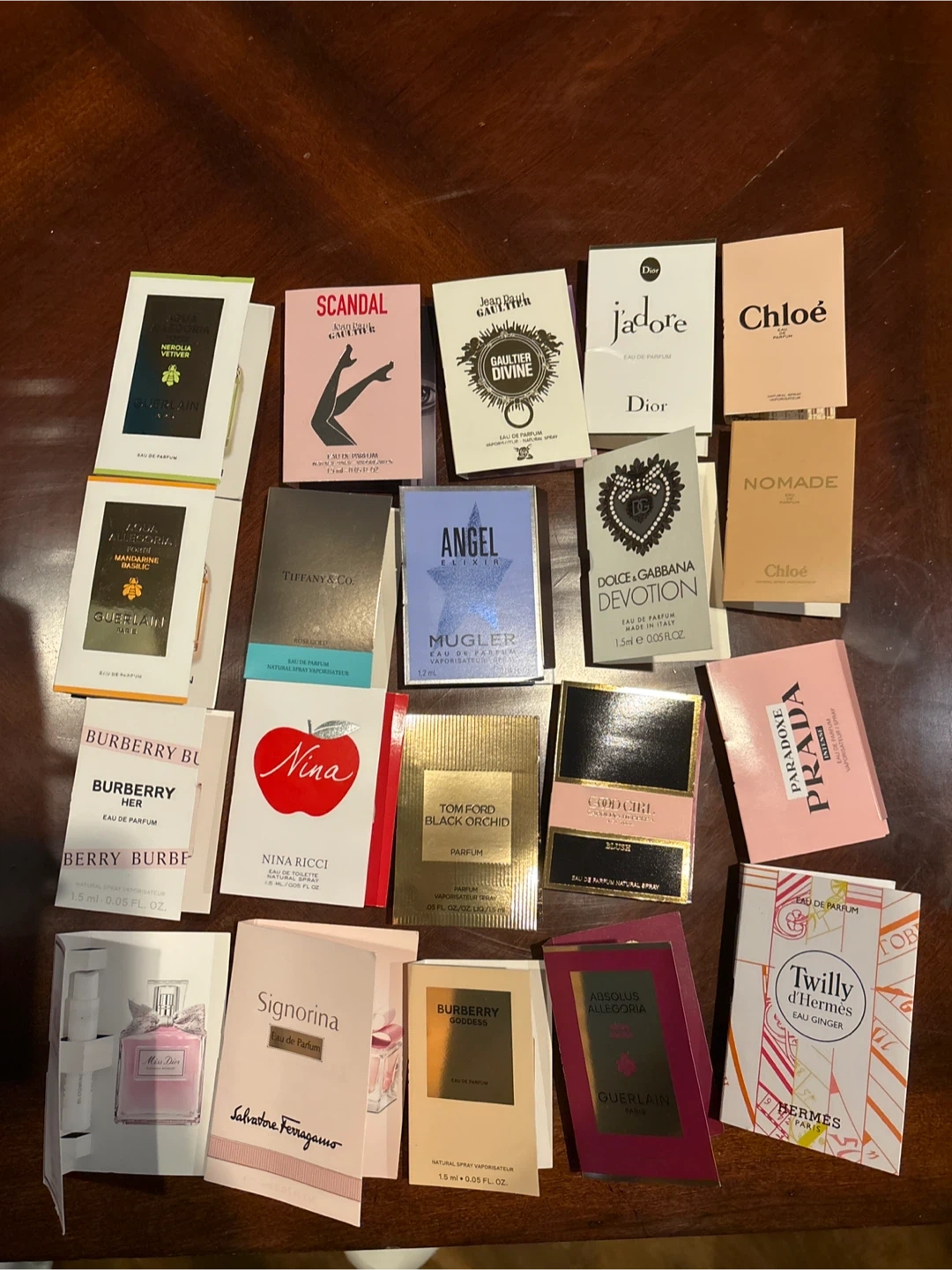 Selling a collection of designer perfume samples! Includes a variety of scents from brands like Dior (J'adore), Chanel, Burberry (Her, Goddess), Chloe (Nomade), Tom Ford (Black Orchid), and more! Perfect for trying out new fragrances before committing to a full bottle