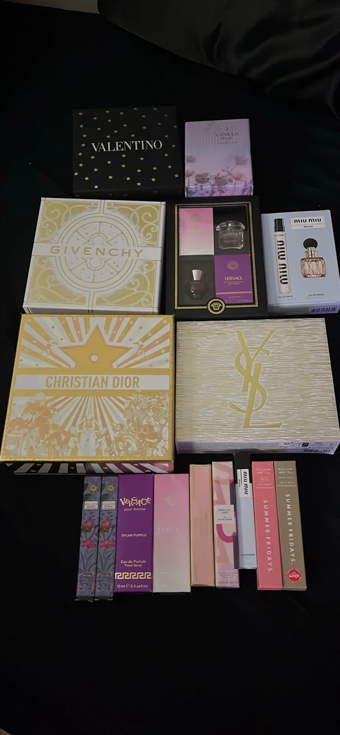 9Selling a mixed lot of perfumes from various brands! Includes: - Ariana Grande $20 - Good Girl $25 - Summer Fridays - Miu Miu $25 for travel size $35 for box - Gucci $30 - Versace $30 -Christian Dior $110 -YSL $80 -Valentino $100 -Givenchy $100 -Summer Fridays Lip Gloss $20 Perfect for trying out new scents or building your collection.