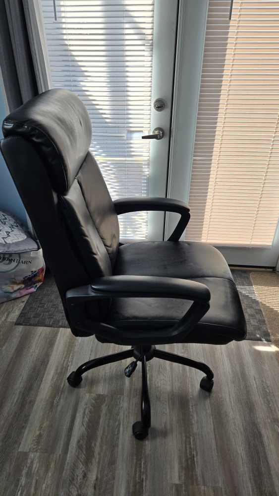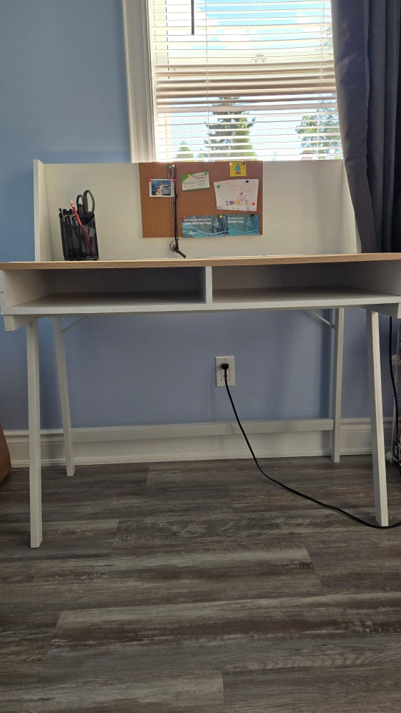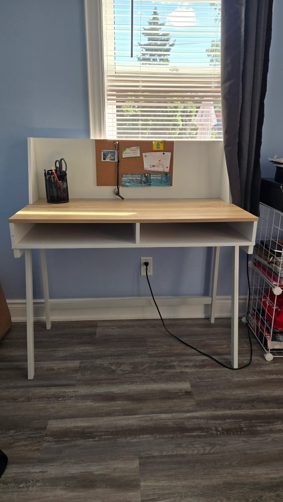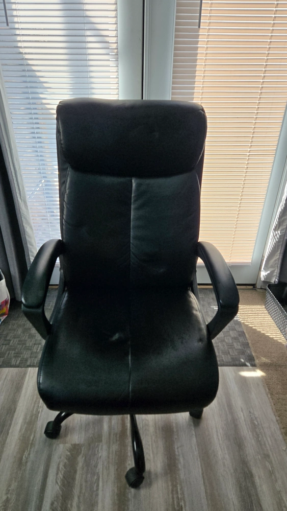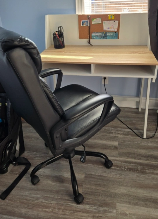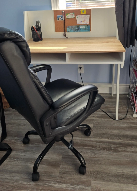Selling a desk and office chair set, perfect for a home office or student space! The desk has a clean, modern look with a work surface and built-in storage. The office chair is black and it is in pretty good condition,barely used.