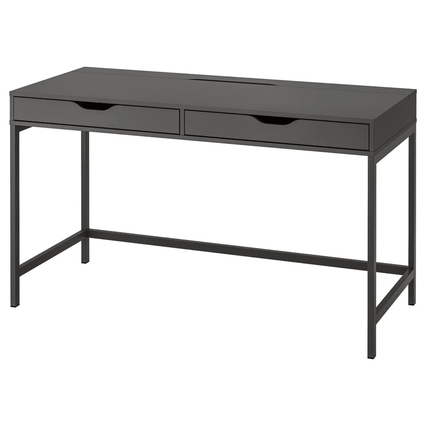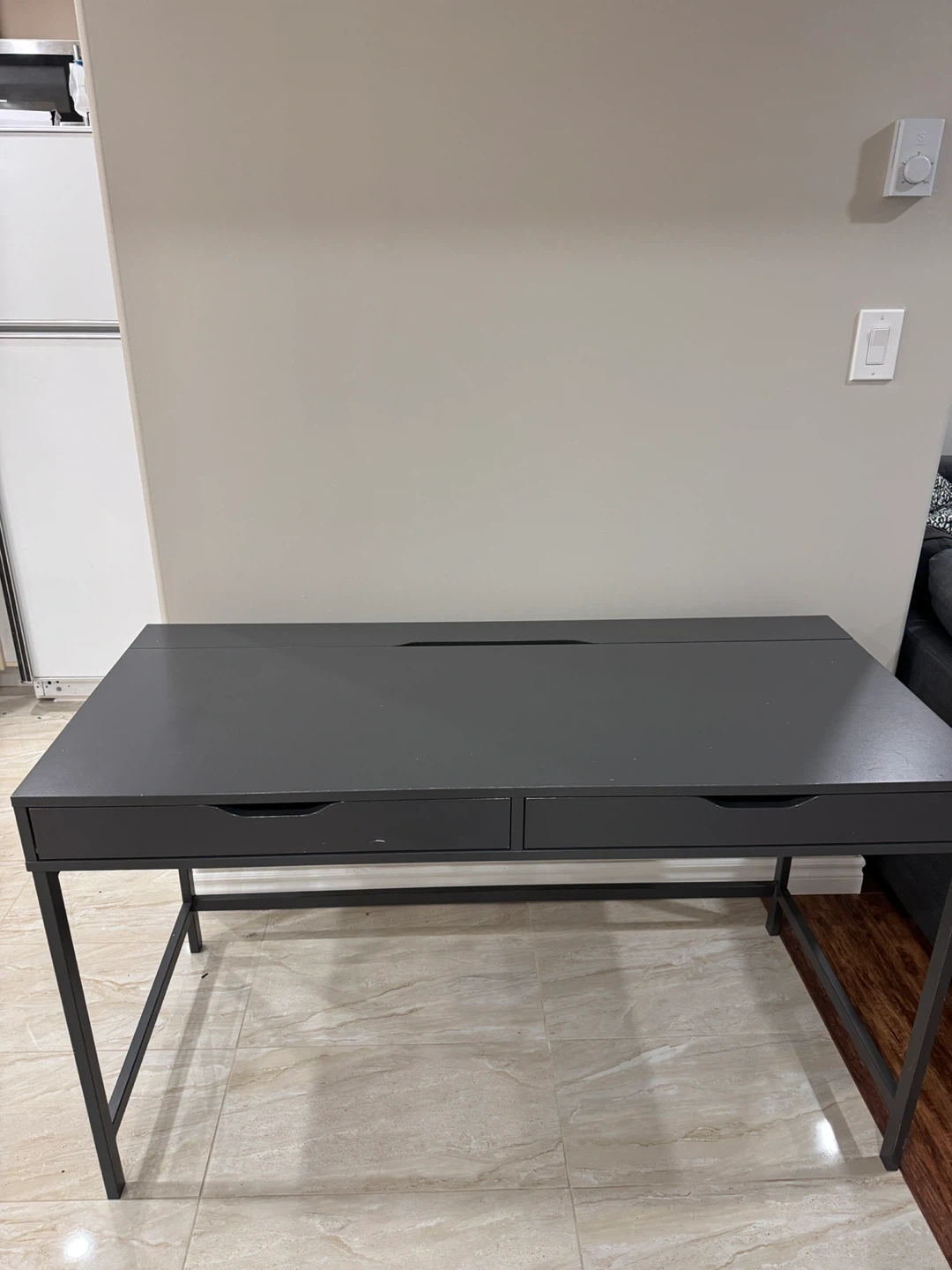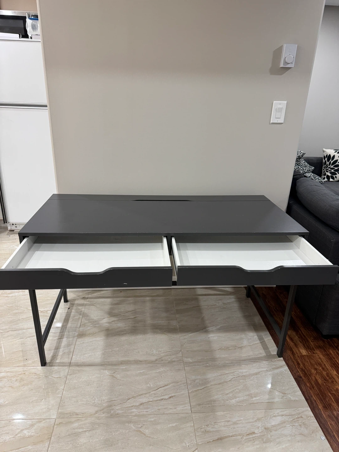 Selling an IKEA Alex desk in dark grey! Great condition overall! Fully functional, with a few light scratches from regular use. The desk features a sleek design with two drawers for storage. Dimensions are 132x58 cm (52x22 7/8 ").