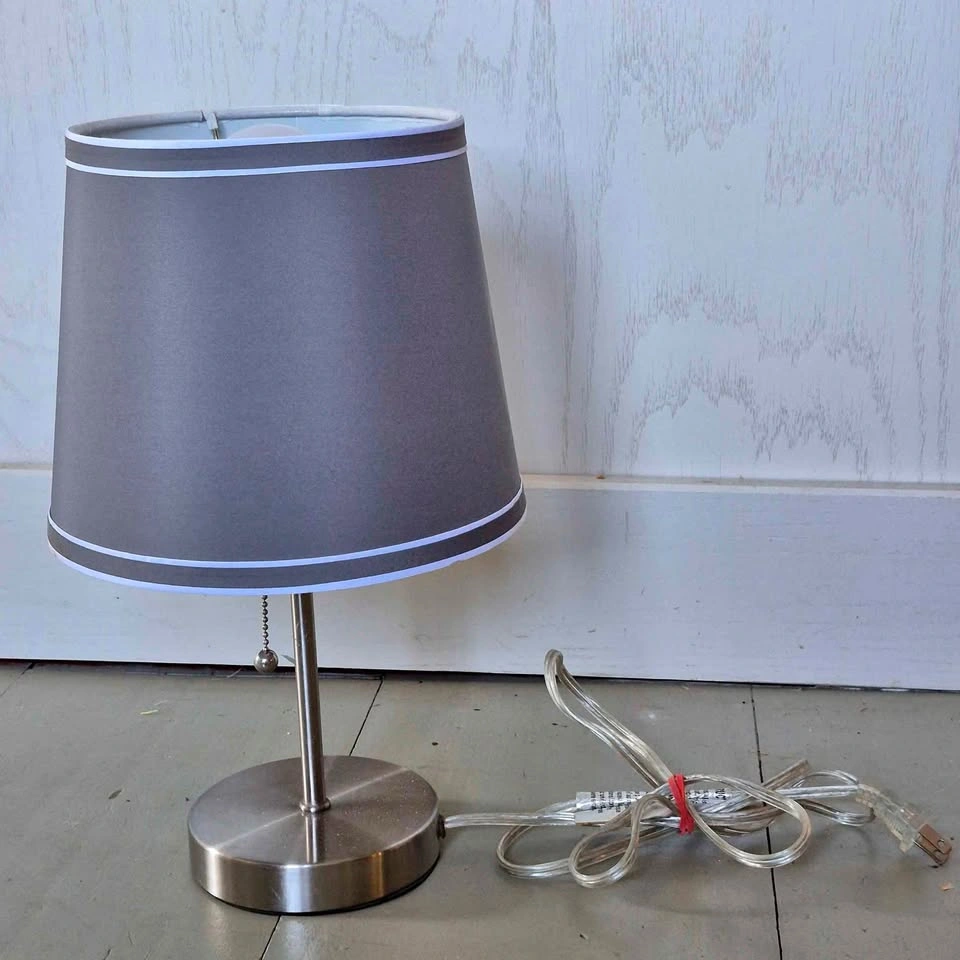 Great desk Lamp with pull chain. 15" high. Shade is 9" wide at bottom and tapers to 7" at the top.