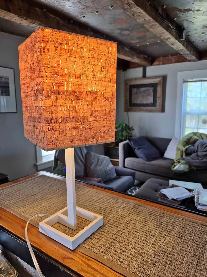Cork lampshade casts a warm glow. Great way to create a welcoming workspace. 19" high. Shade is 7"across × 9" high.