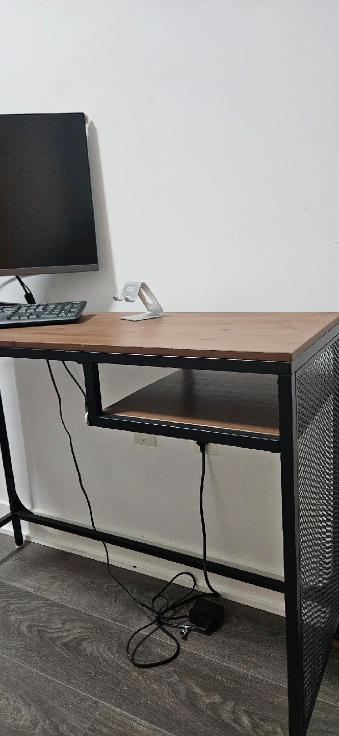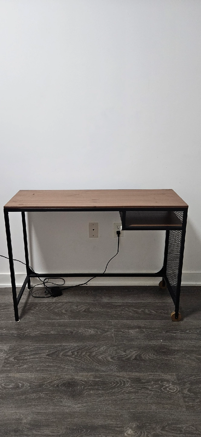 Selling a sturdy desk with a metal frame and a wood-look top! It's in great shape and perfect for a home office or study space. The desk has a small shelf on one side and a mesh metal panel. Dimensions within photos.