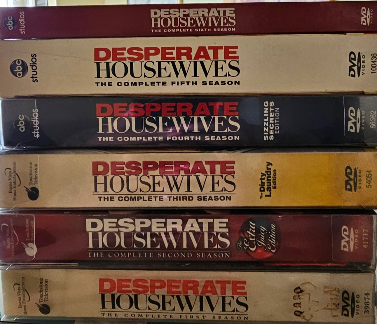 A collection of Desperate Housewives seasons. The seasons are displayed stacked on top of each other. These DVDs would be perfect for a relaxing night in watching your favourite show. $140 obo.
