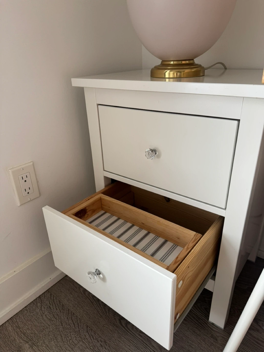 Compact white nightstand with two drawers. Features clear crystal knobs for a touch of sparkle. The drawer interiors are lined with a striped fabric.