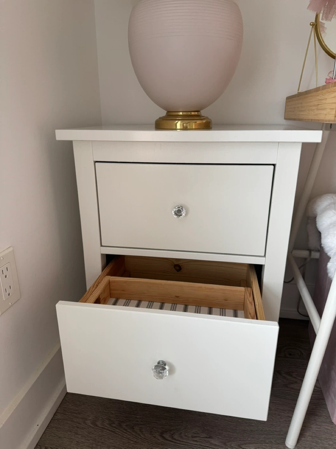 Compact white nightstand with two drawers. Features clear crystal knobs for a touch of sparkle. The drawer interiors are lined with a striped fabric.