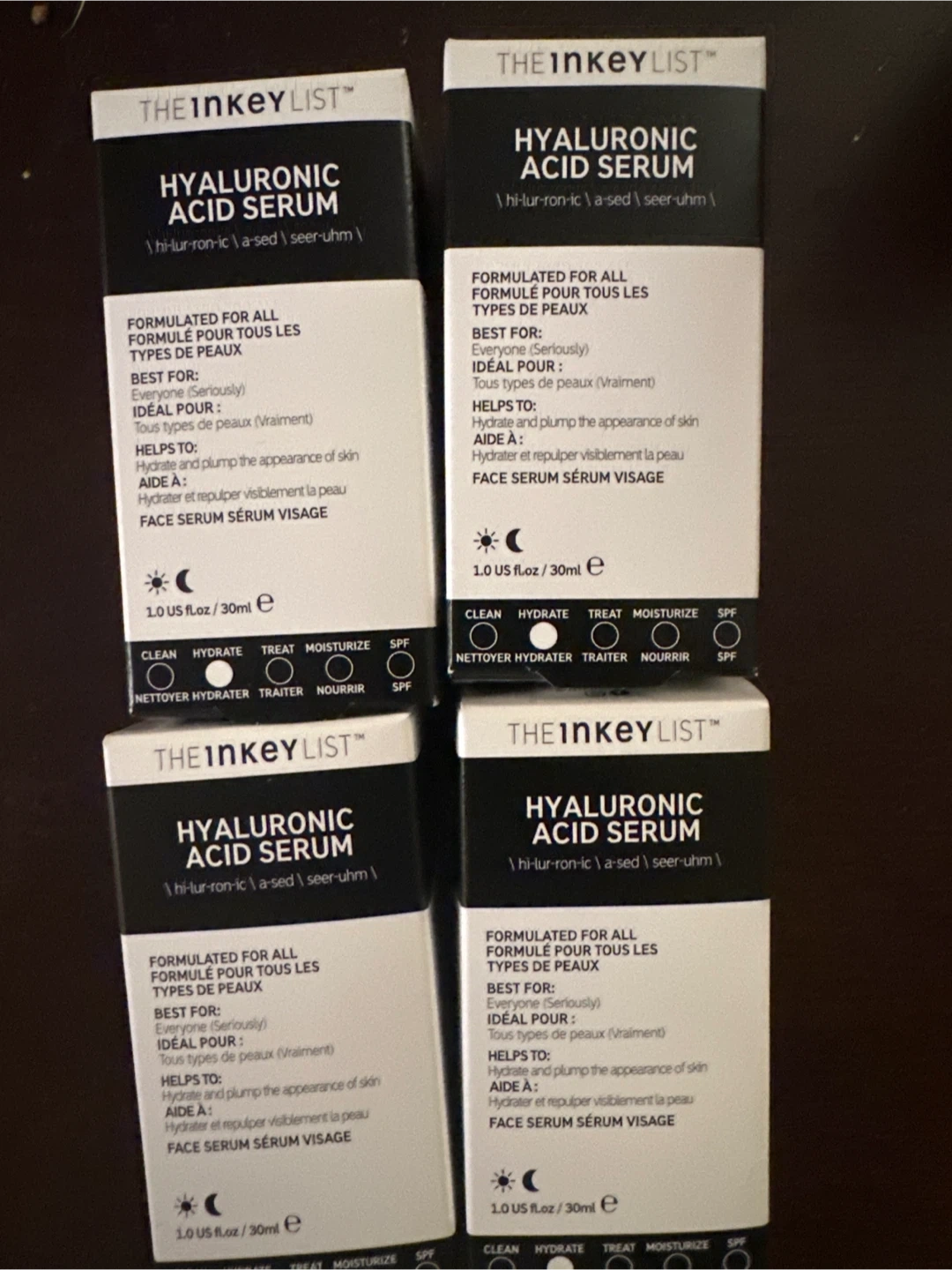 Four bottles of THE inkey LIST Hyaluronic Acid Serum. Each bottle contains 30ml of product. This face serum is formulated to hydrate and plump the appearance of skin. It's suitable for all skin types.