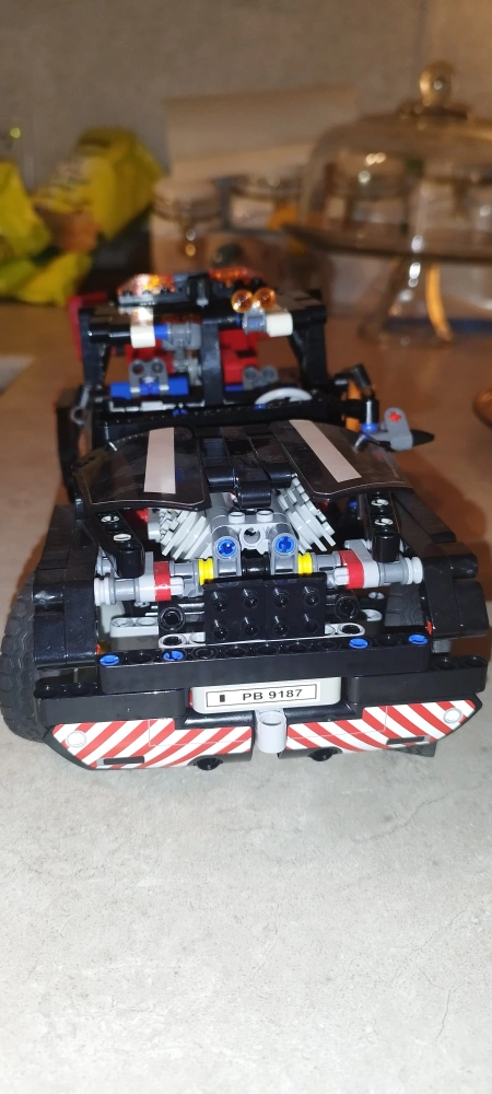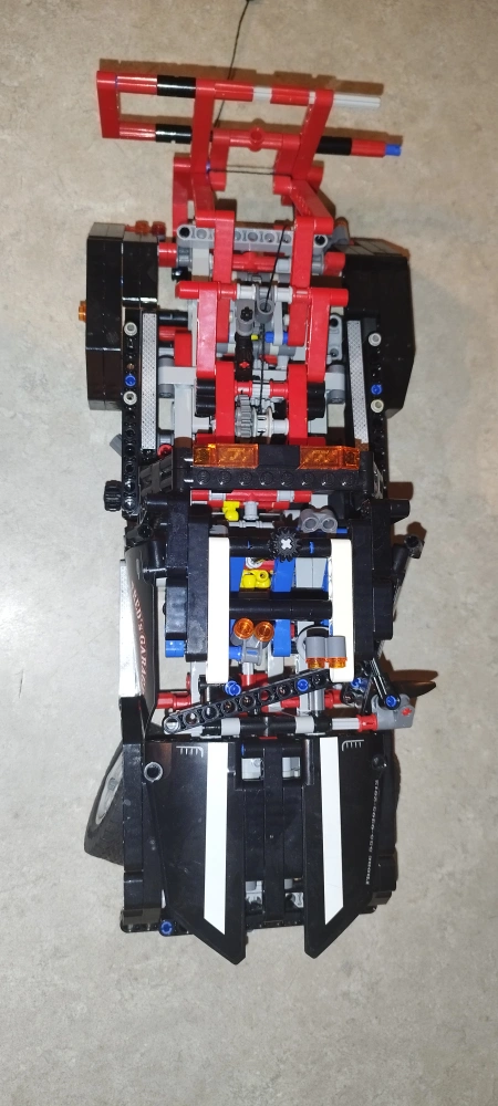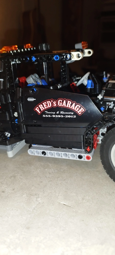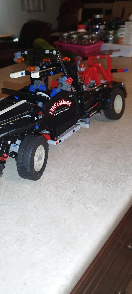 Custom-built LEGO Technic tow truck. Features detailed engine, working tow arm, and Fred's Garage decals. Many intricate parts. Great for collectors or builders.