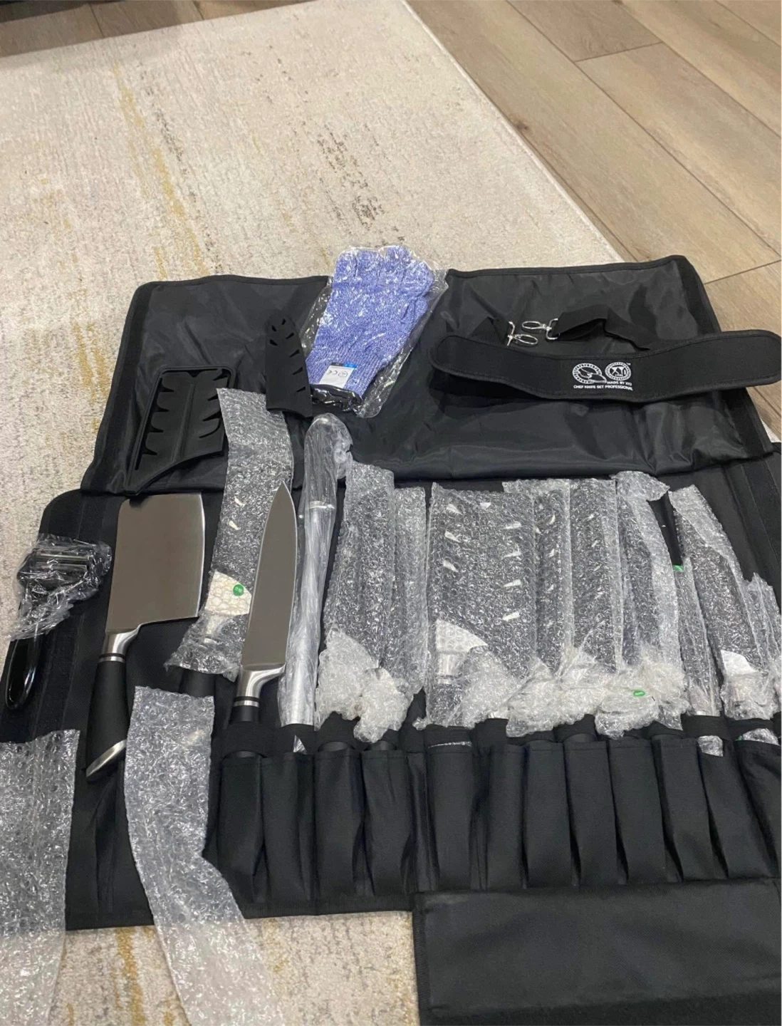 This is a comprehensive set of 17 kitchen knives and accessories, including a cleaver, chef knives, and paring knives. It comes with a durable rolling bag for easy transport and storage. The set also includes a sharpener, peeler, and cut-resistant gloves. Perfect for professional chefs or home cooks!