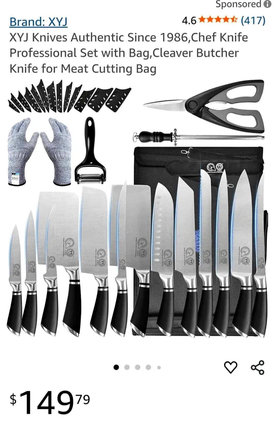 This is a comprehensive set of 17 kitchen knives and accessories, including a cleaver, chef knives, and paring knives. It comes with a durable rolling bag for easy transport and storage. The set also includes a sharpener, peeler, and cut-resistant gloves. Perfect for professional chefs or home cooks!