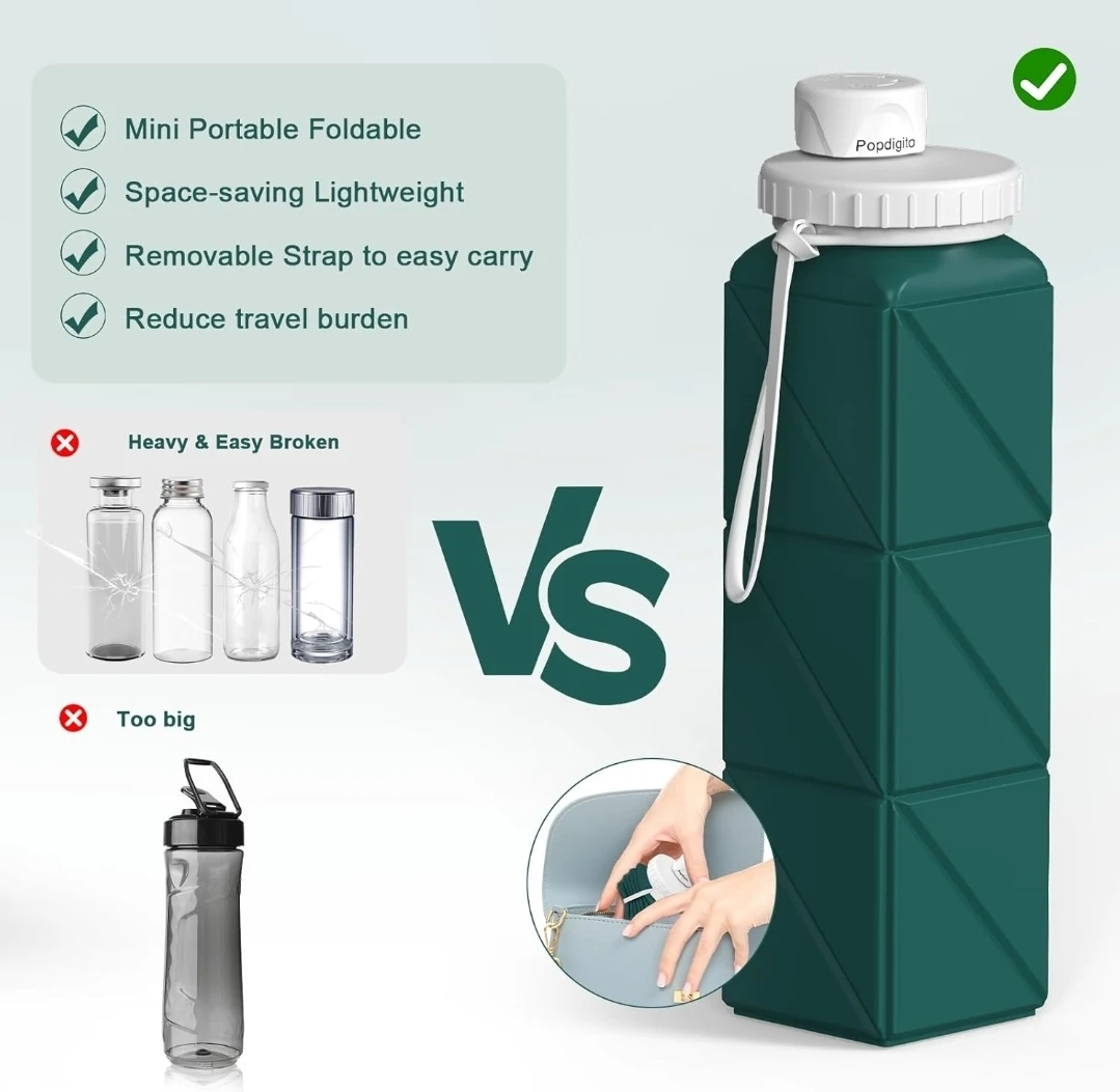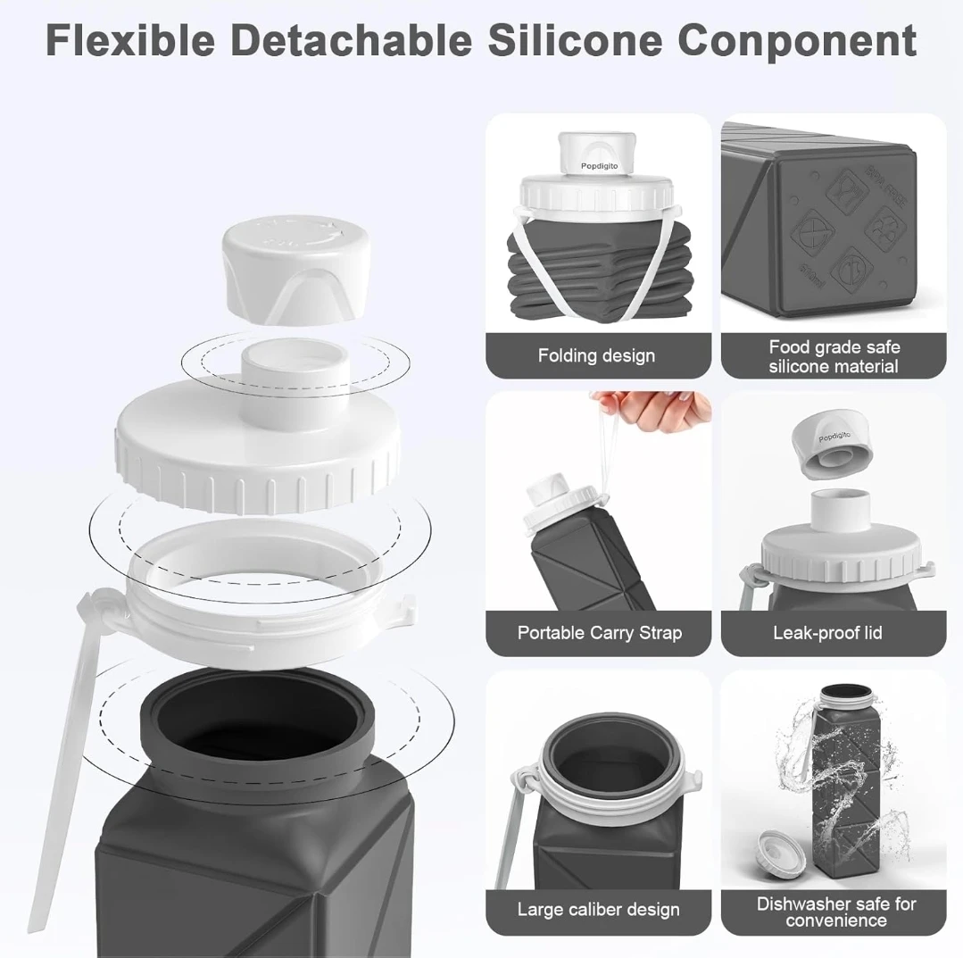 This Popdigito water bottle is made of healthy, food-grade silicone. It's BPA-free and leak-proof, perfect for on-the-go hydration. Its lightweight, foldable design makes it easy to save space and carry anywhere, ideal for travel, sports, or daily use!