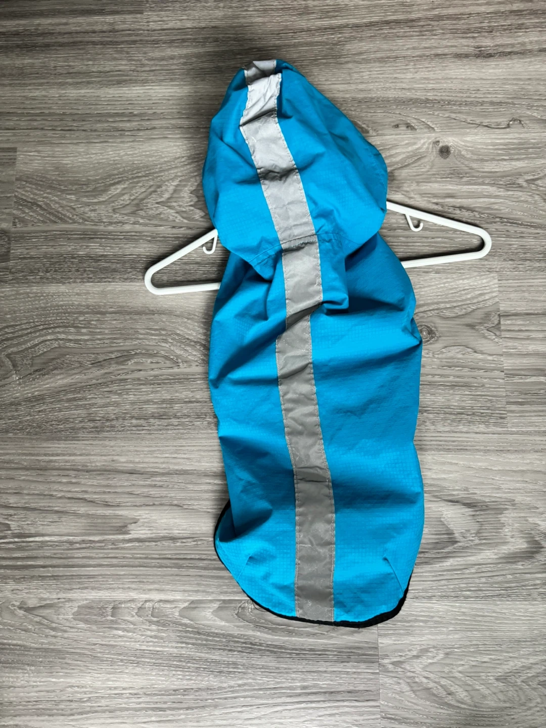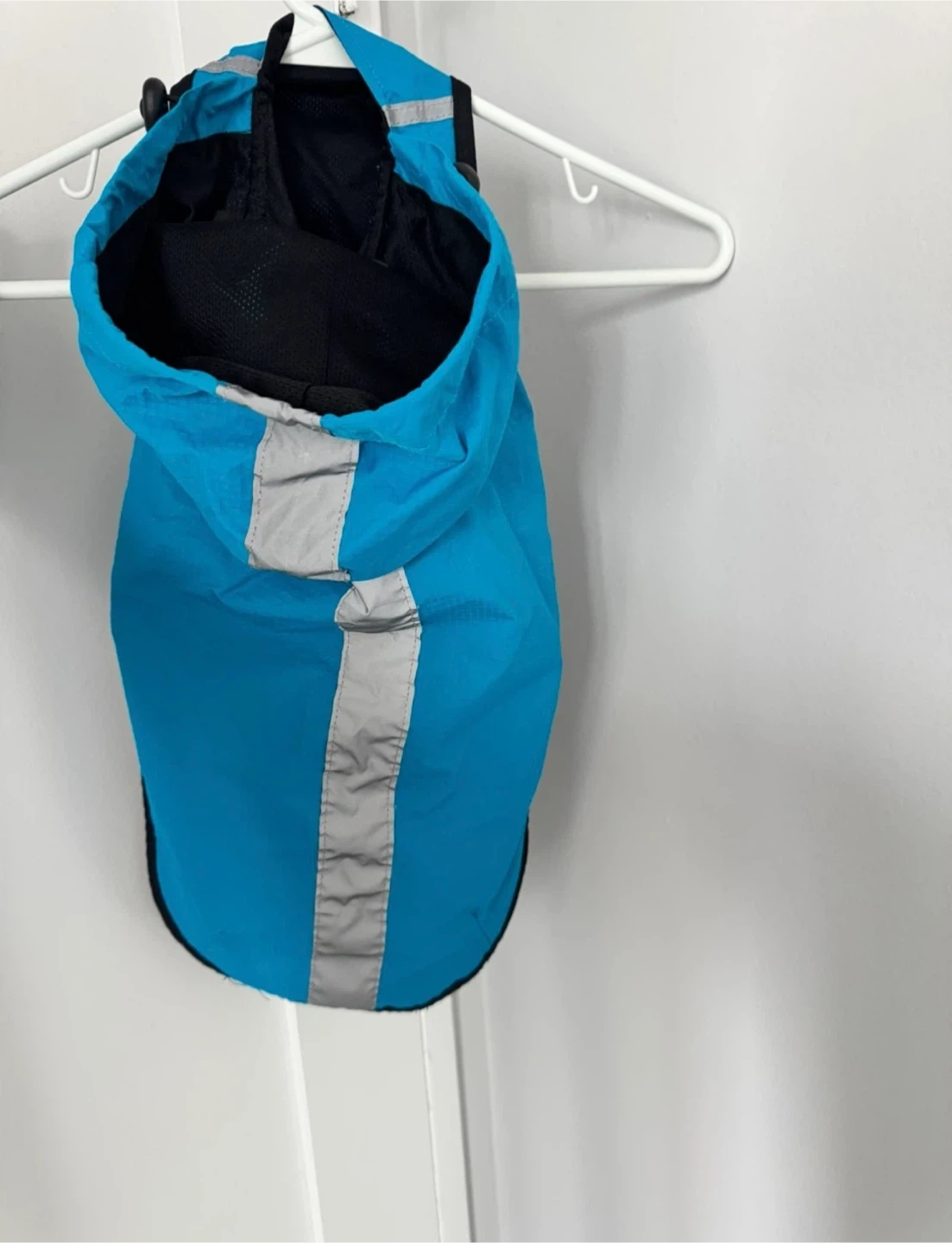 This blue dog raincoat has a reflective strip down the back and hood for visibility. It's made of waterproof material and has a black inner lining. Fastens with velcro.