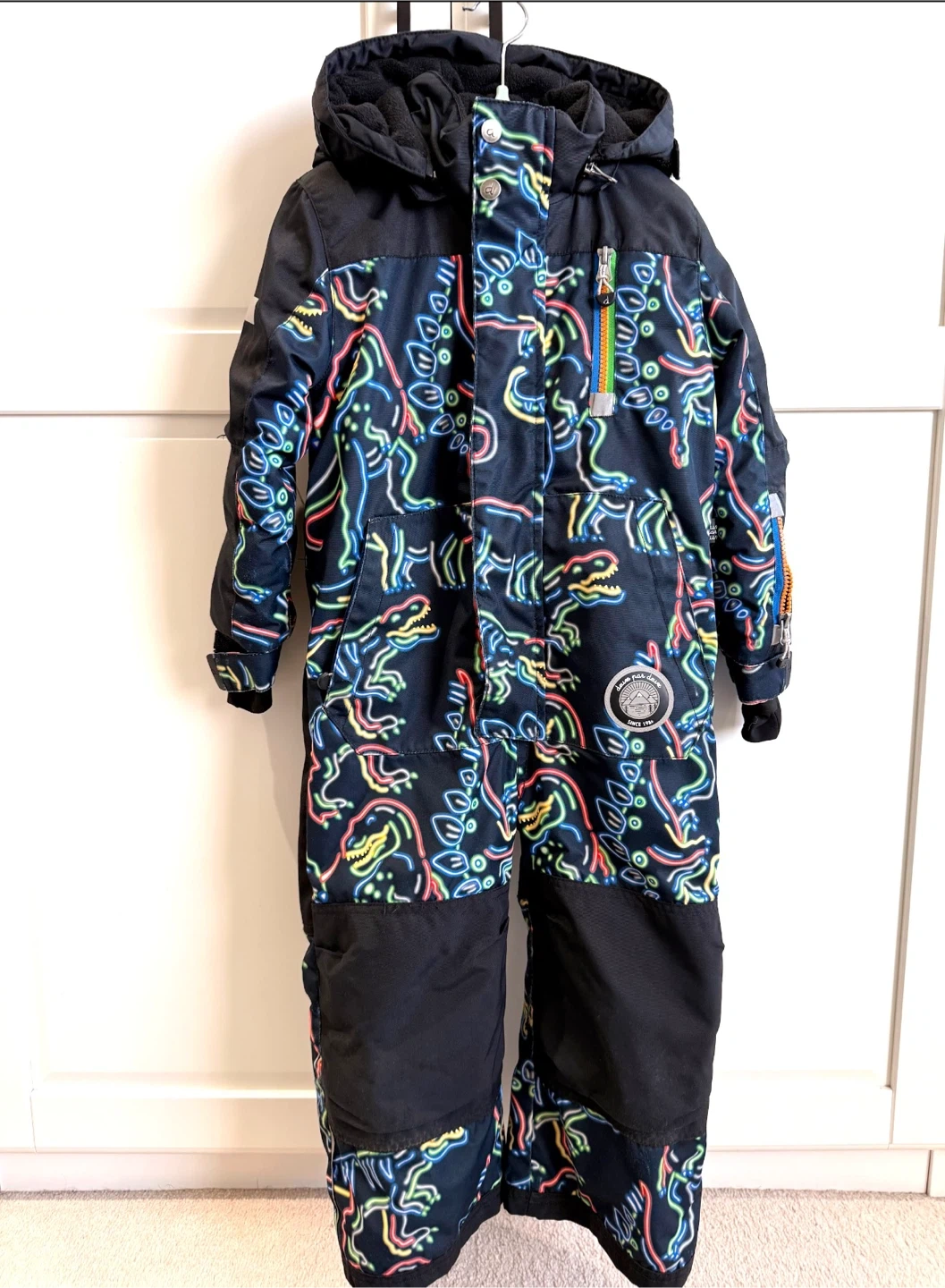 5Deux par Deux snowsuit for kids! It's black with a fun dinosaur print. Perfect for keeping your little one warm and dry during winter adventures Size 4