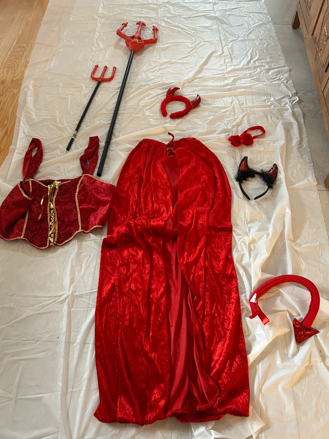 10Devil costume includes the dress, horns, pitchfork and other accessories as seen in the photos. Great for Halloween!
