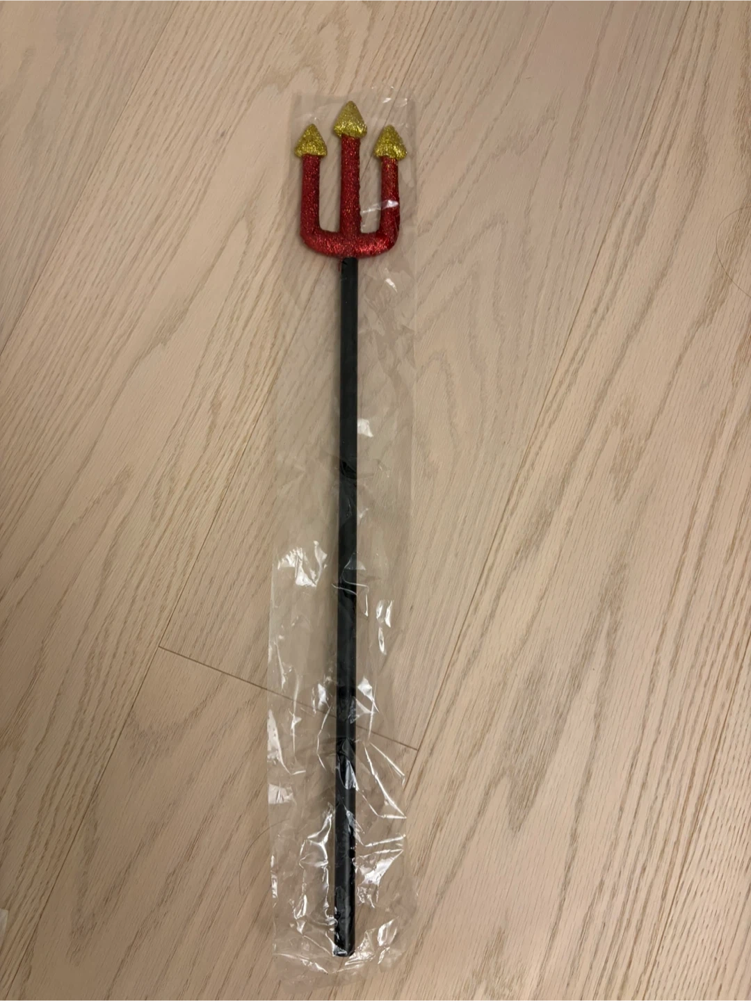 44Selling a devil's trident prop. Perfect for Halloween or costume parties. It features a red glittery trident head with gold tips and a black handle.