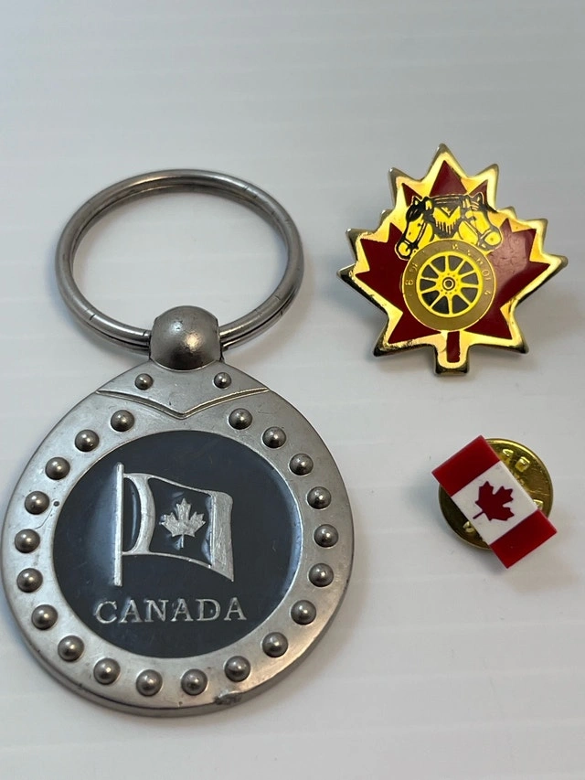 This collection includes a variety of Canadian-themed pins and a keychain, perfect for collectors or as souvenirs. The set features a maple leaf chuck wagon pin, a Canadian flag pin, and a keychain with a Canadian flag design. All in like new condition. Pick up only! Key features: Maple Leaf Chuck Wagon Pin, Canadian Flag Pin, Canada Keychain. These pins and keychain are just waiting for a new home.