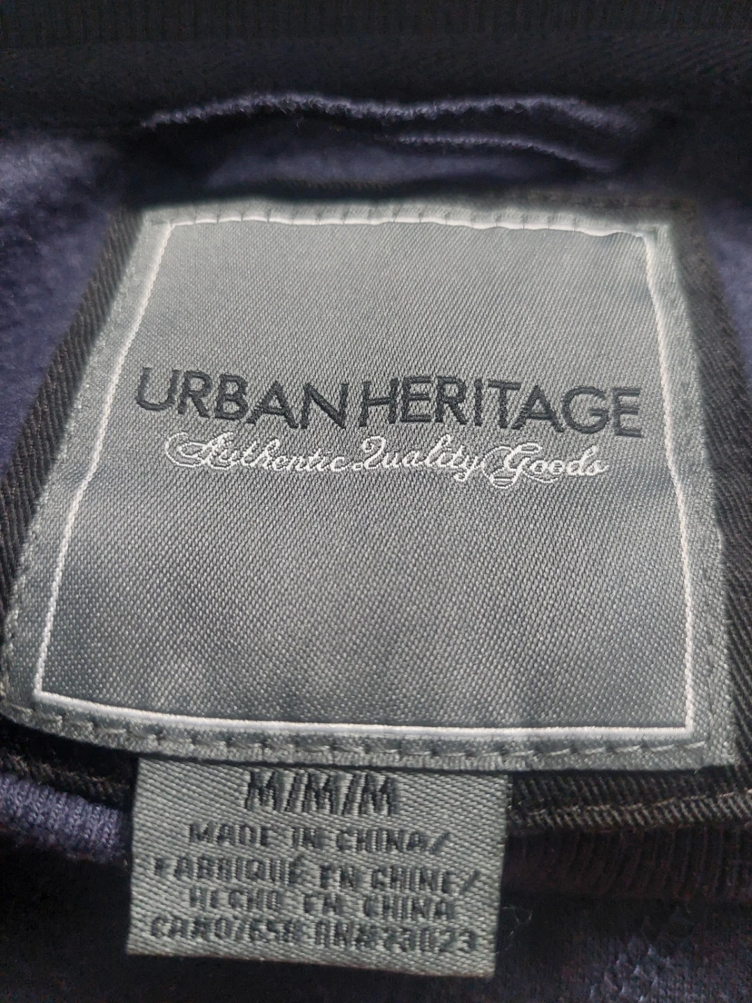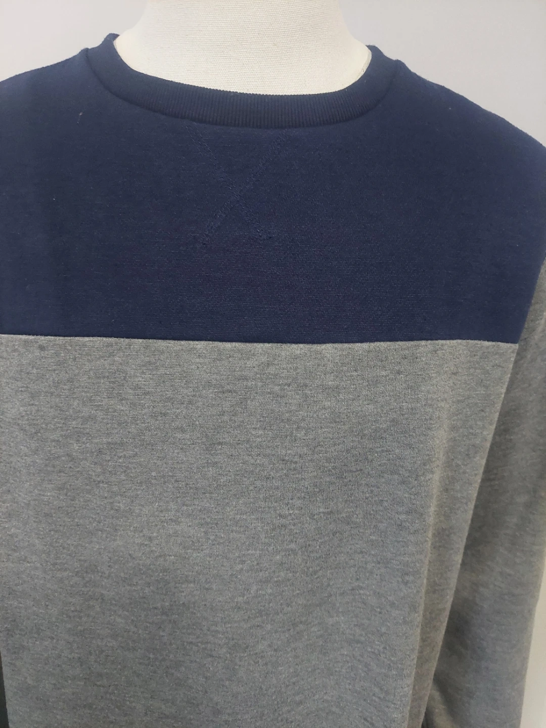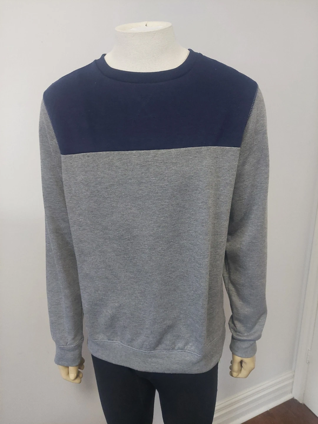 This Urban Heritage sweatshirt has a colour block design with grey and navy panels. It's a size medium. This crewneck is comfy and casual, perfect for everyday wear!
