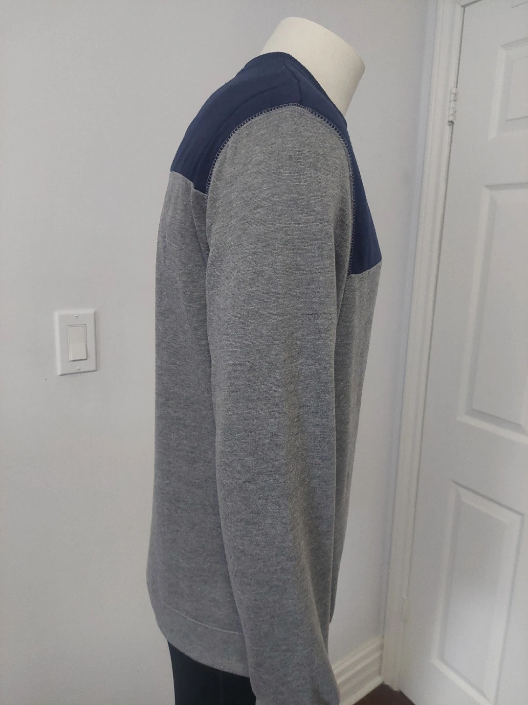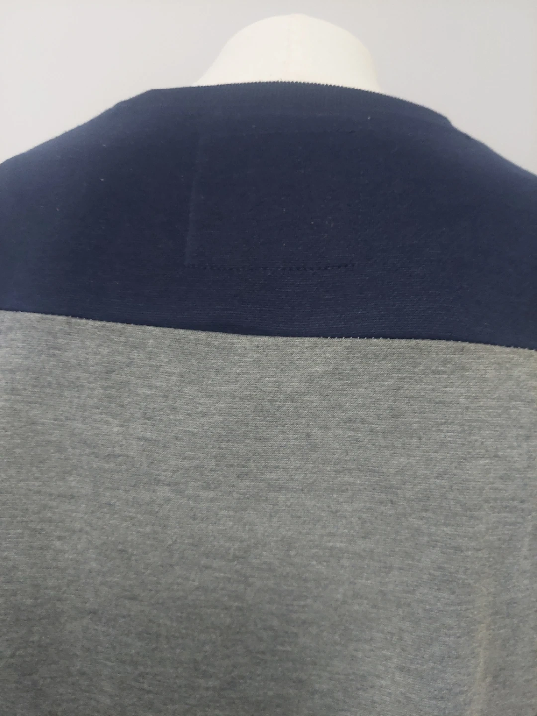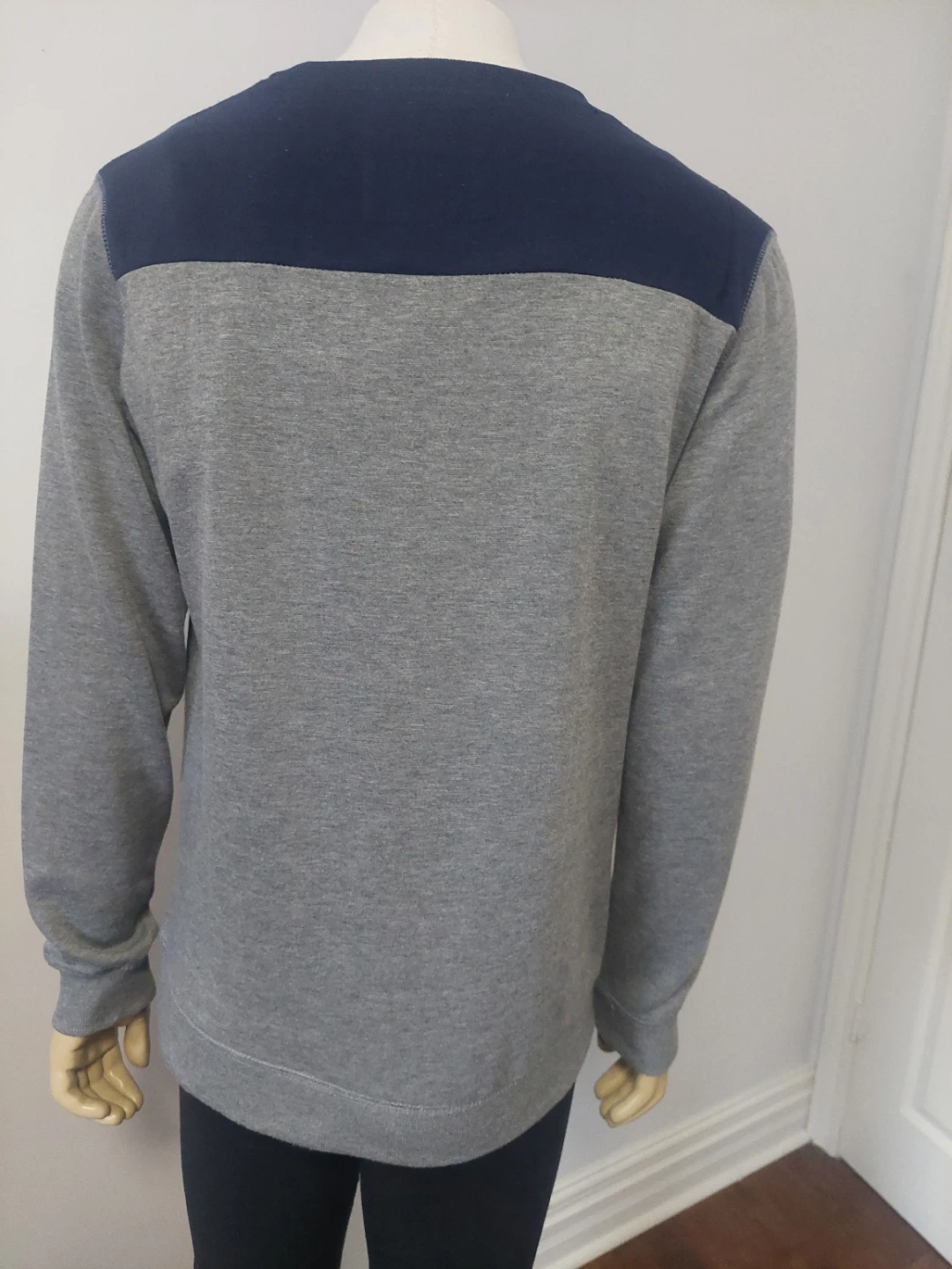 This Urban Heritage sweatshirt has a colour block design with grey and navy panels. It's a size medium. This crewneck is comfy and casual, perfect for everyday wear!