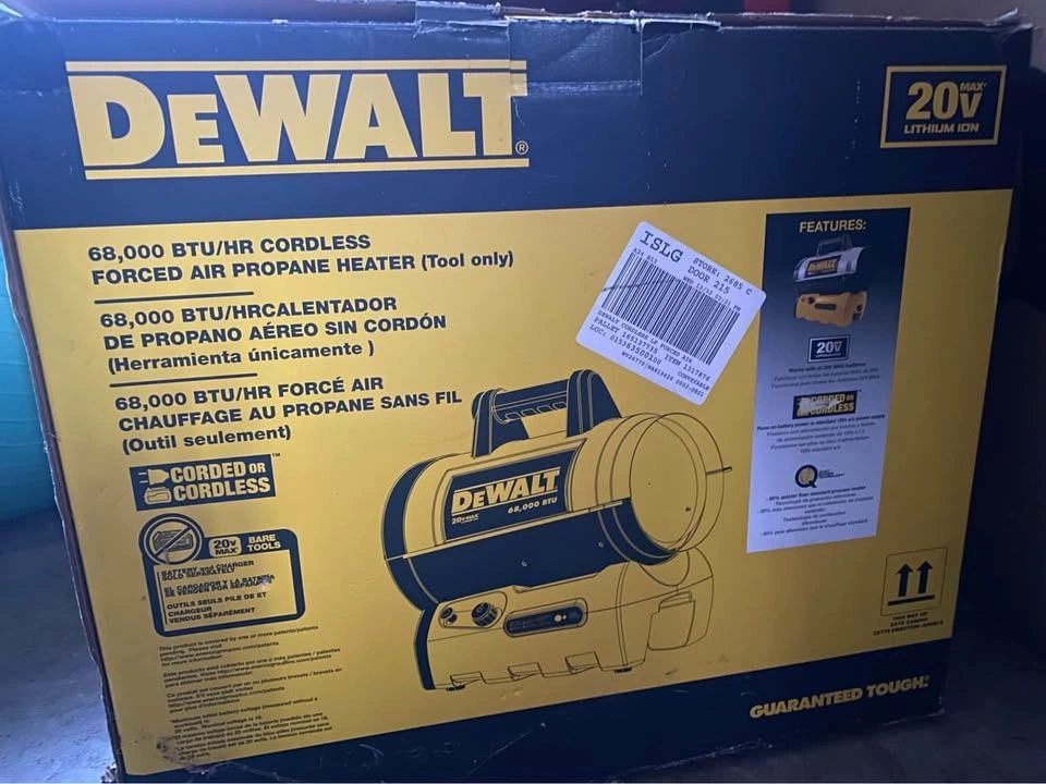 10DeWalt 68,000 BTU 20V Forced Air Propane Heater Model DXH70CFAV Only used a few times. Great condition. Perfect for warming up a garage. Cordless portable, for indoor use. Cash Only. Will meet locally for pickup.