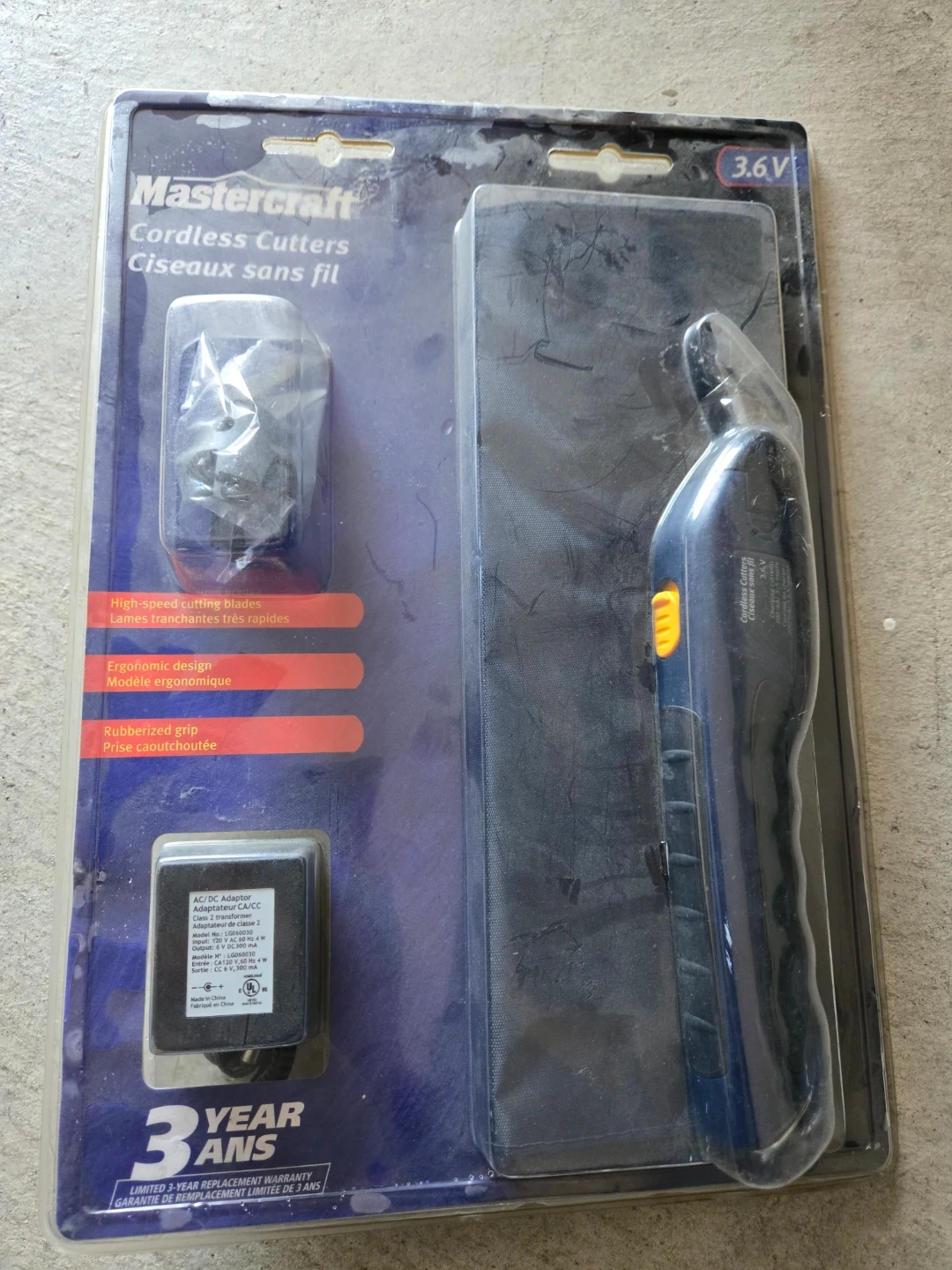 This Mastercraft cordless cutter is designed for high-speed cutting. It features an ergonomic design and a rubberized grip for comfort. Includes an AC/DC adapter.