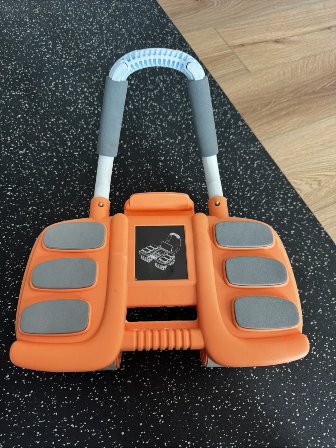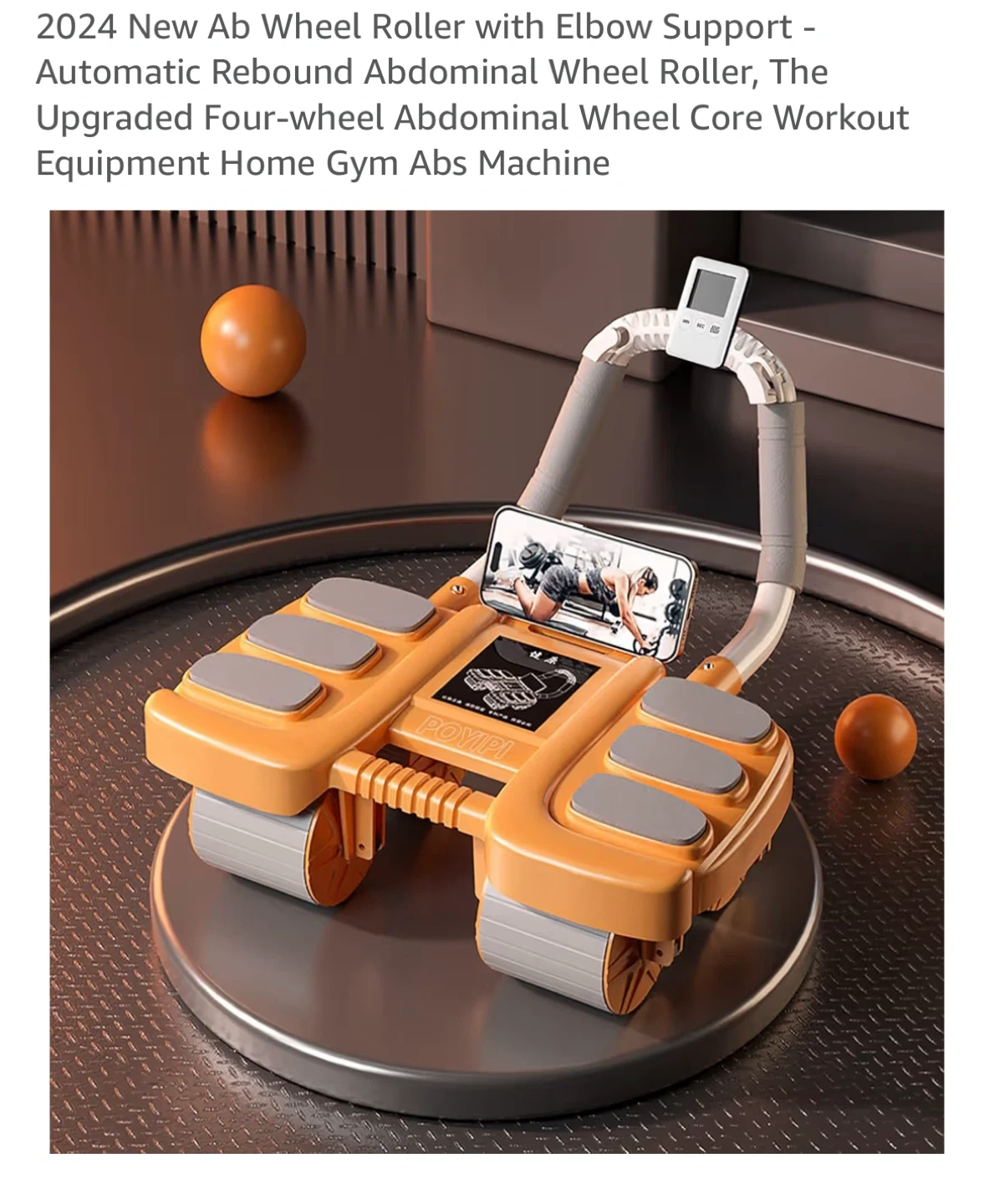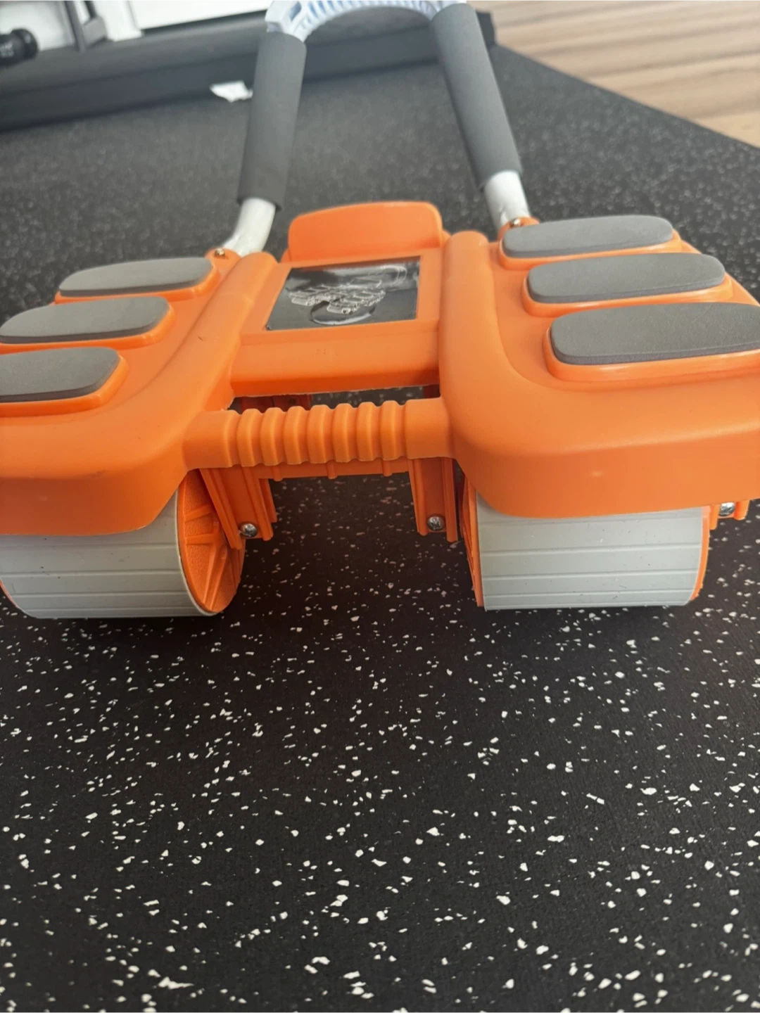 This is a four-wheel ab roller with built-in elbow support. It's made of durable plastic and features comfortable padded handles. Great for home workouts and core strengthening!