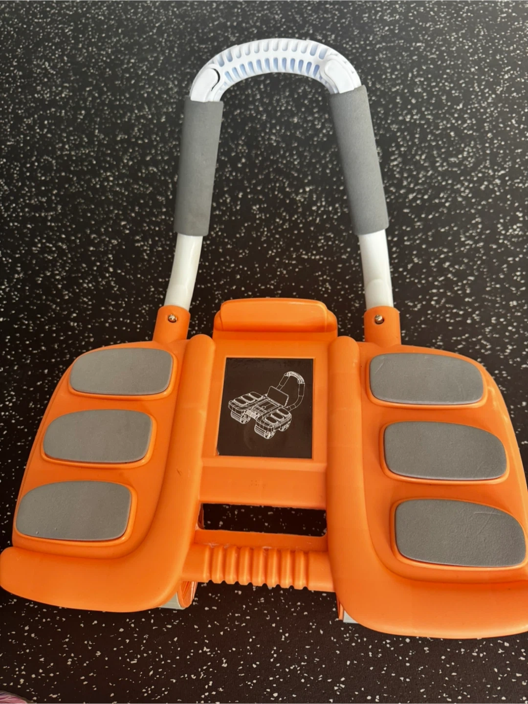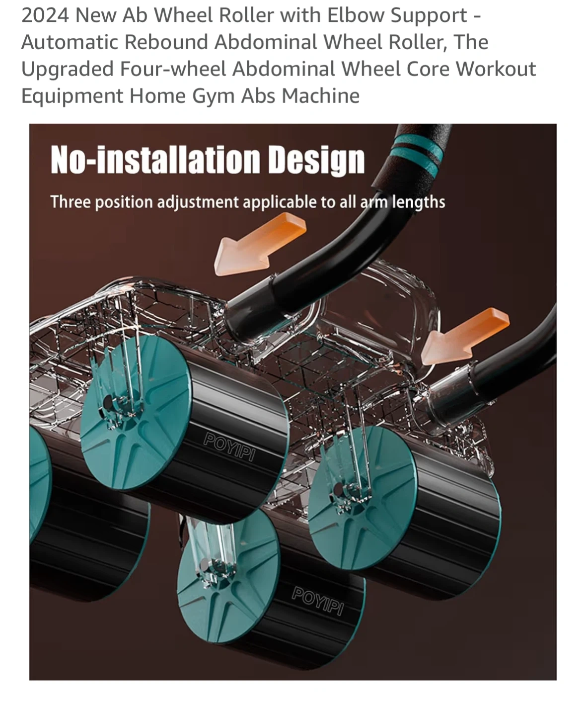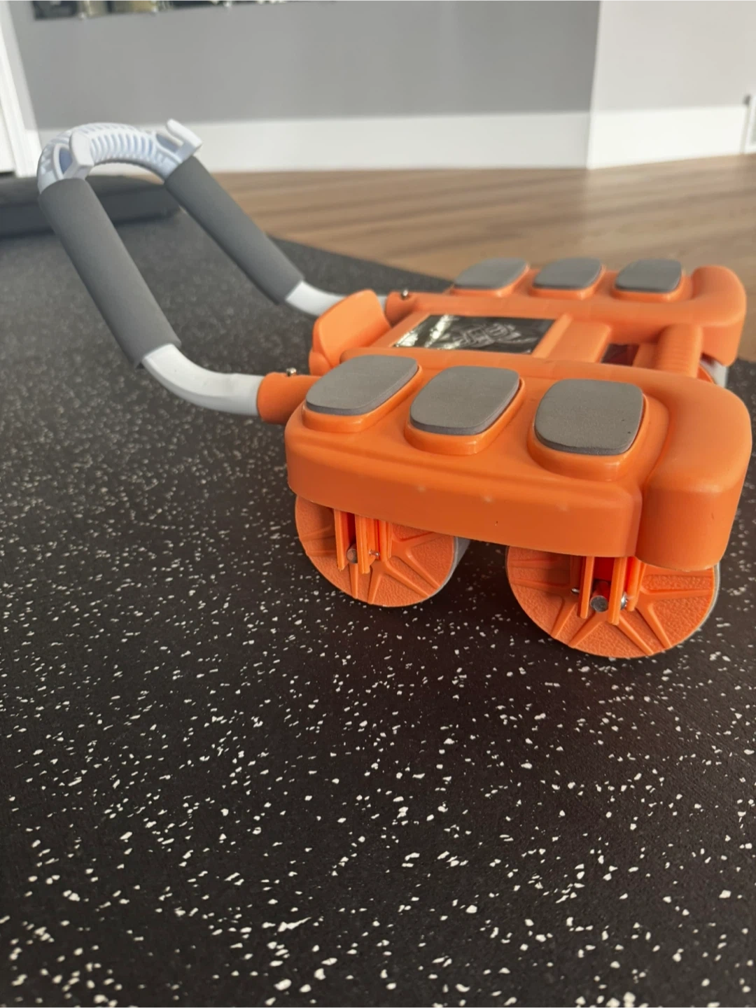 This is a four-wheel ab roller with built-in elbow support. It's made of durable plastic and features comfortable padded handles. Great for home workouts and core strengthening!