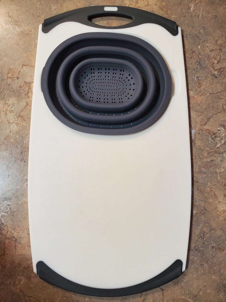 157Collapsible strainer with cutting board. Perfect for food prep and rinsing vegetables. Used but still in good condition.