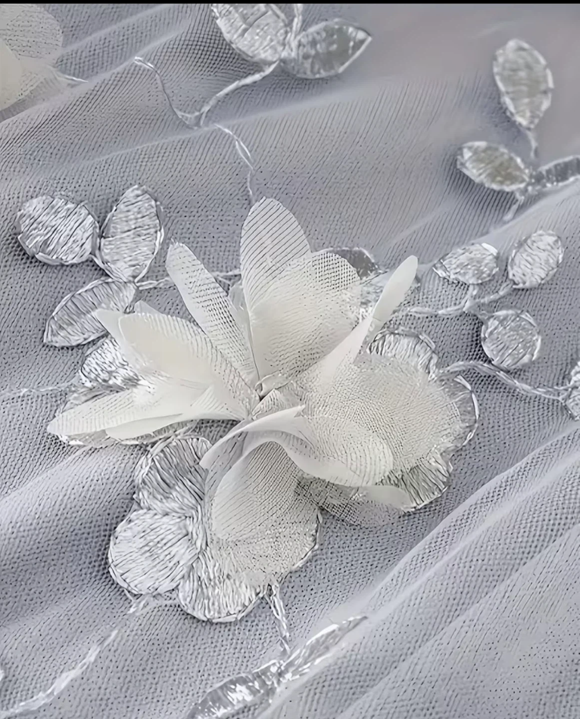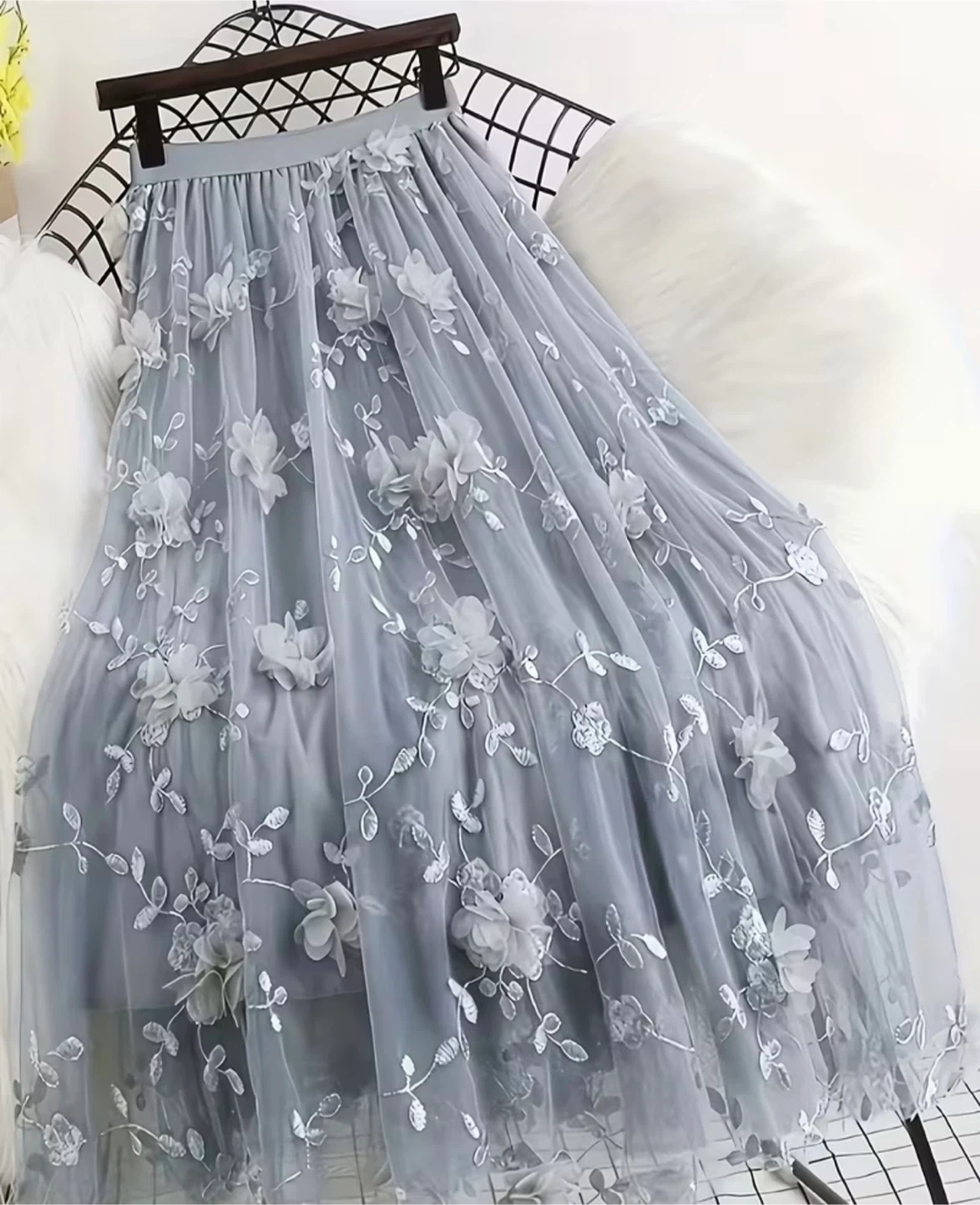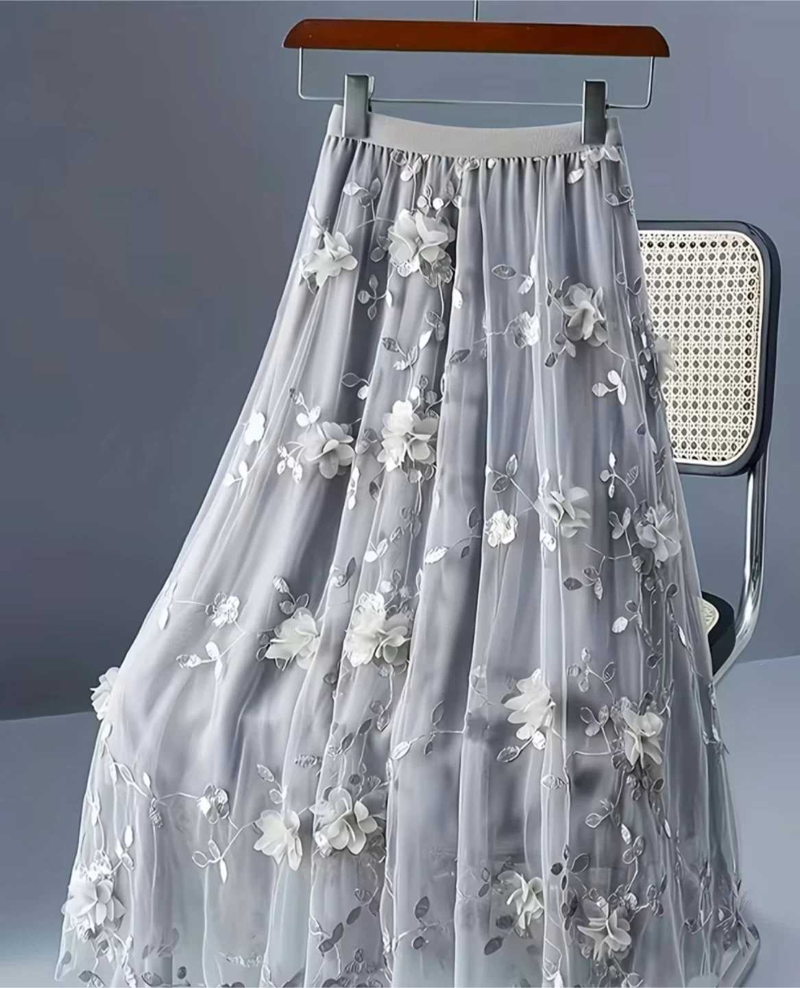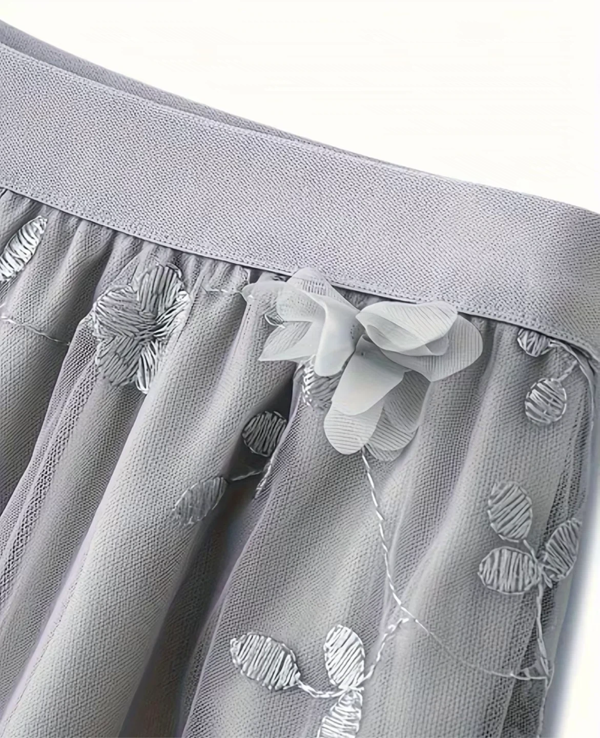 Lovely grey tulle skirt featuring delicate 3D floral appliqués and embroidered leaves. It has a comfortable elastic waistband for a great fit. This skirt is perfect for adding a touch of whimsy to any outfit!