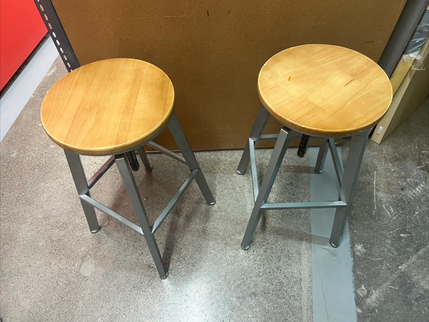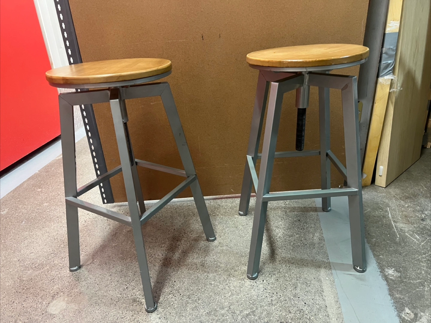 Two adjustable height bar stools. Metal frame, wooden seat. Great for kitchen or bar. Highest hight 29.9” dropping to 23.6”