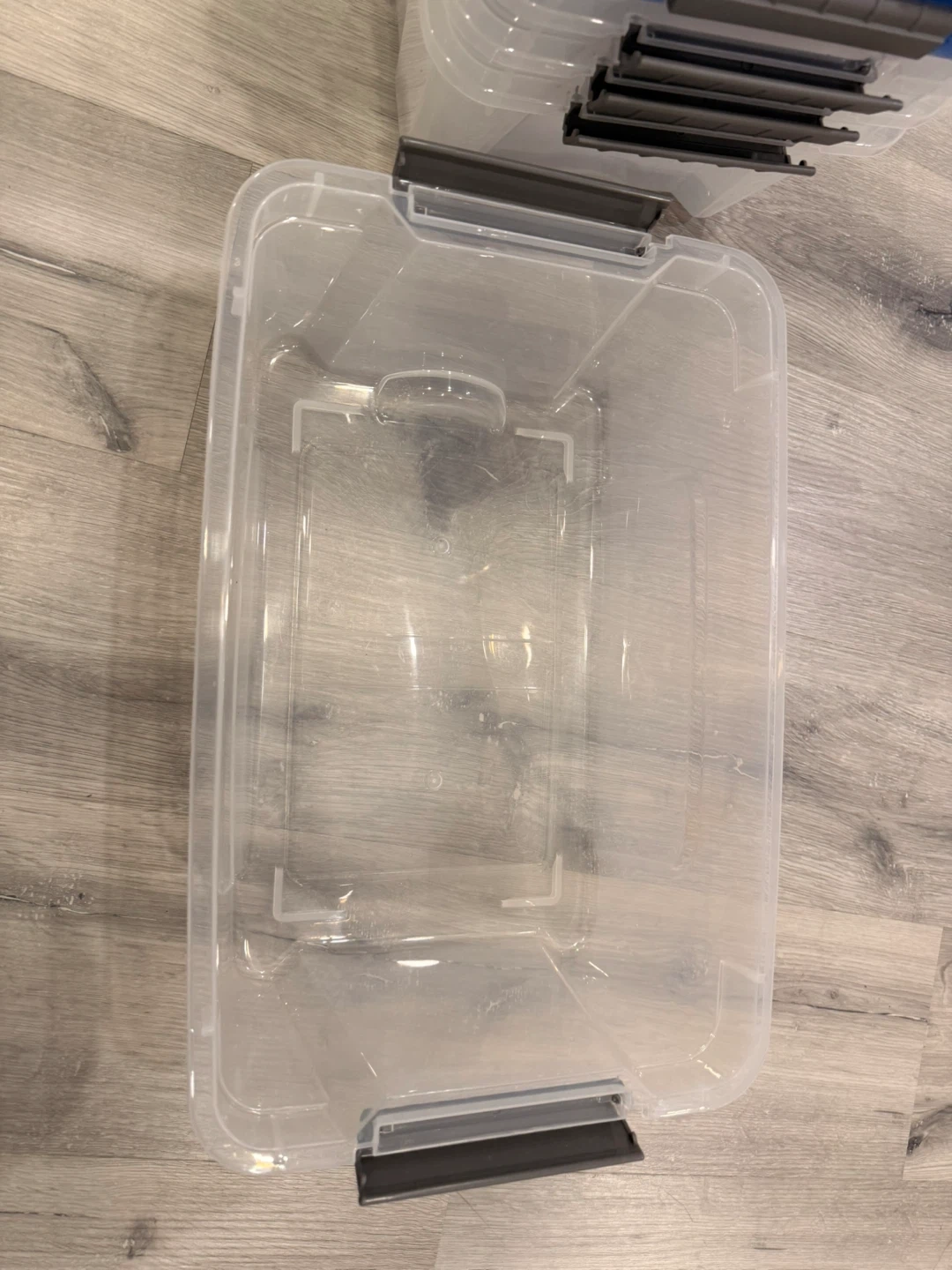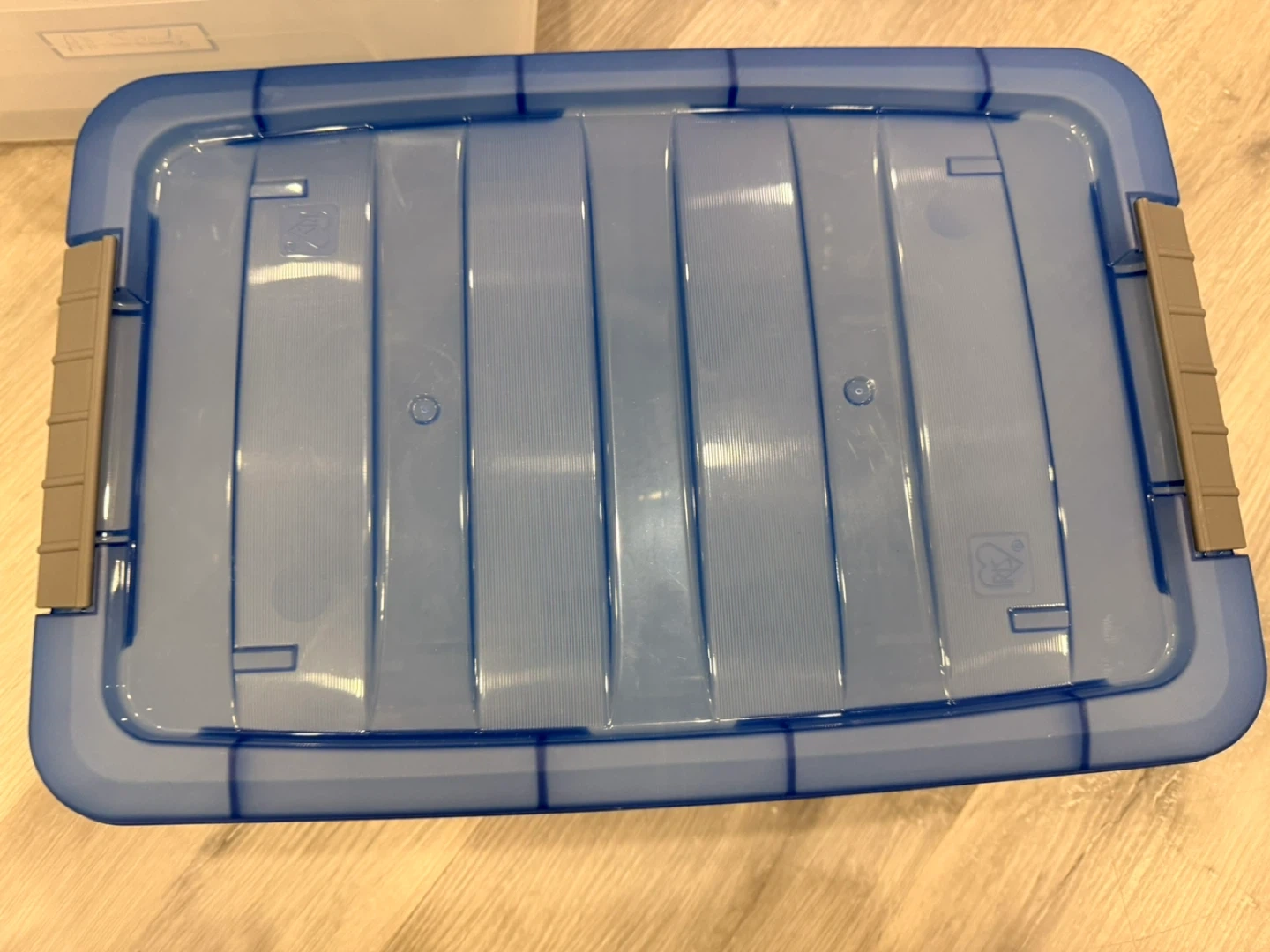 This is a clear plastic storage bin with a blue lid and grey latches. It's suitable for organizing various items. The bin is made of durable plastic. It's great for keeping garages, closets, or basements tidy!