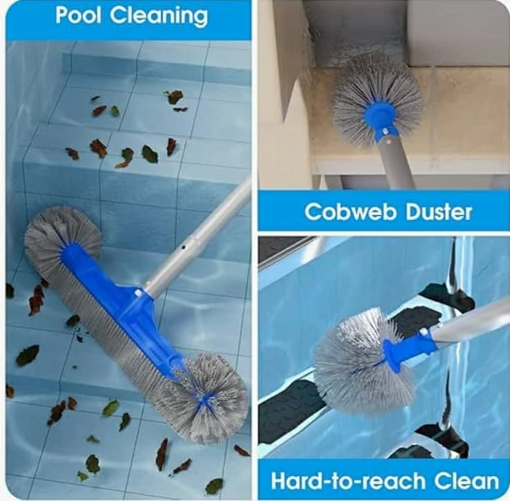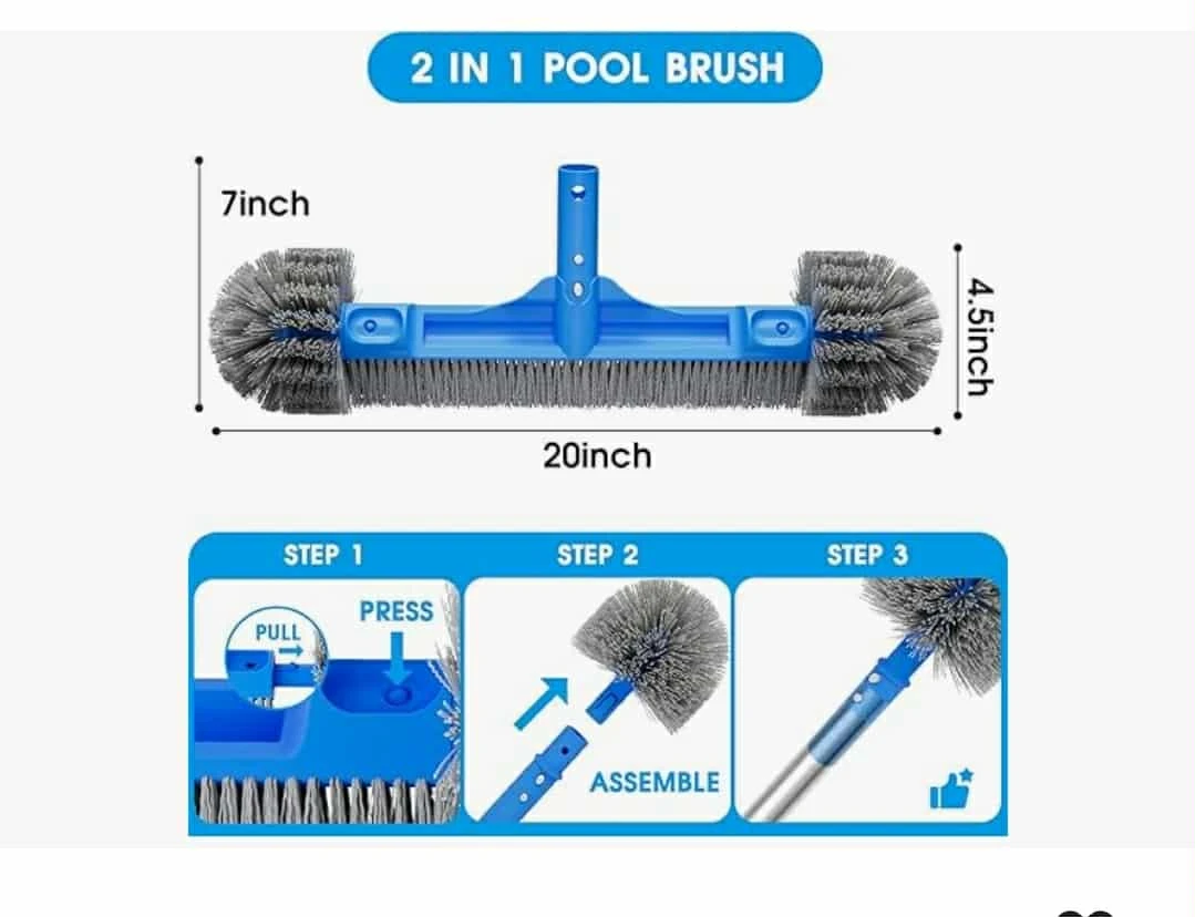 This is a 2-in-1 pool brush that makes cleaning your pool easier! It features a multi-purpose hidden hook for lifting lids and baskets, and retrieving chlorine dispensers and floats. The wavy bristles design provides better cleaning effect, improved adaptability, and increased durability. Dimensions are approximately 7 inches x 4.5 inches x 20 inches.