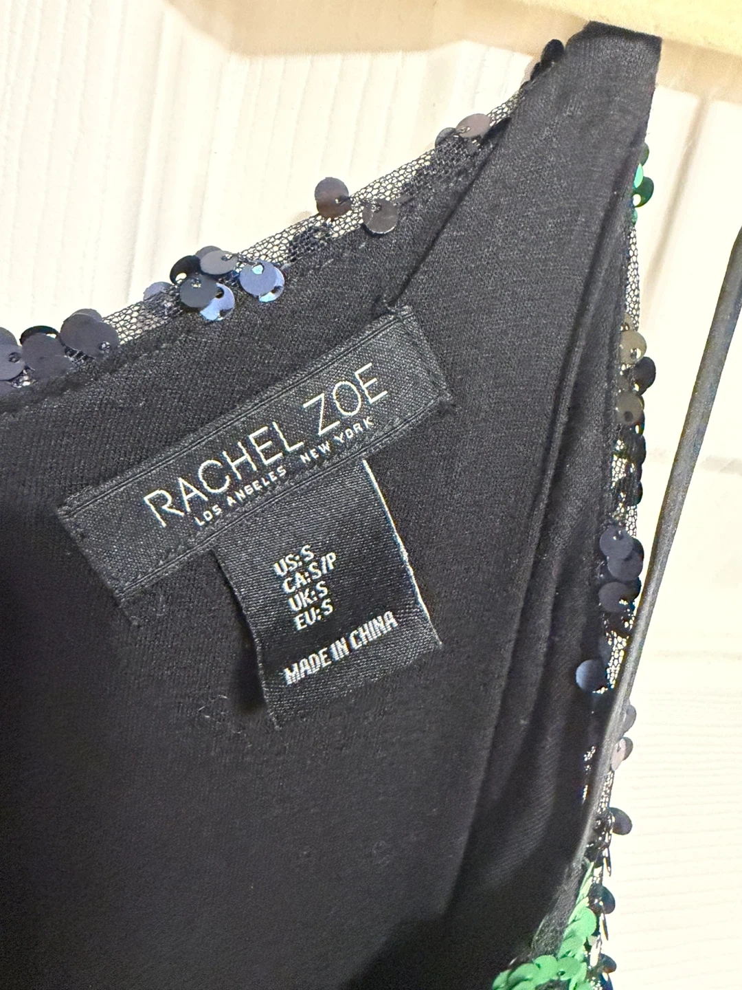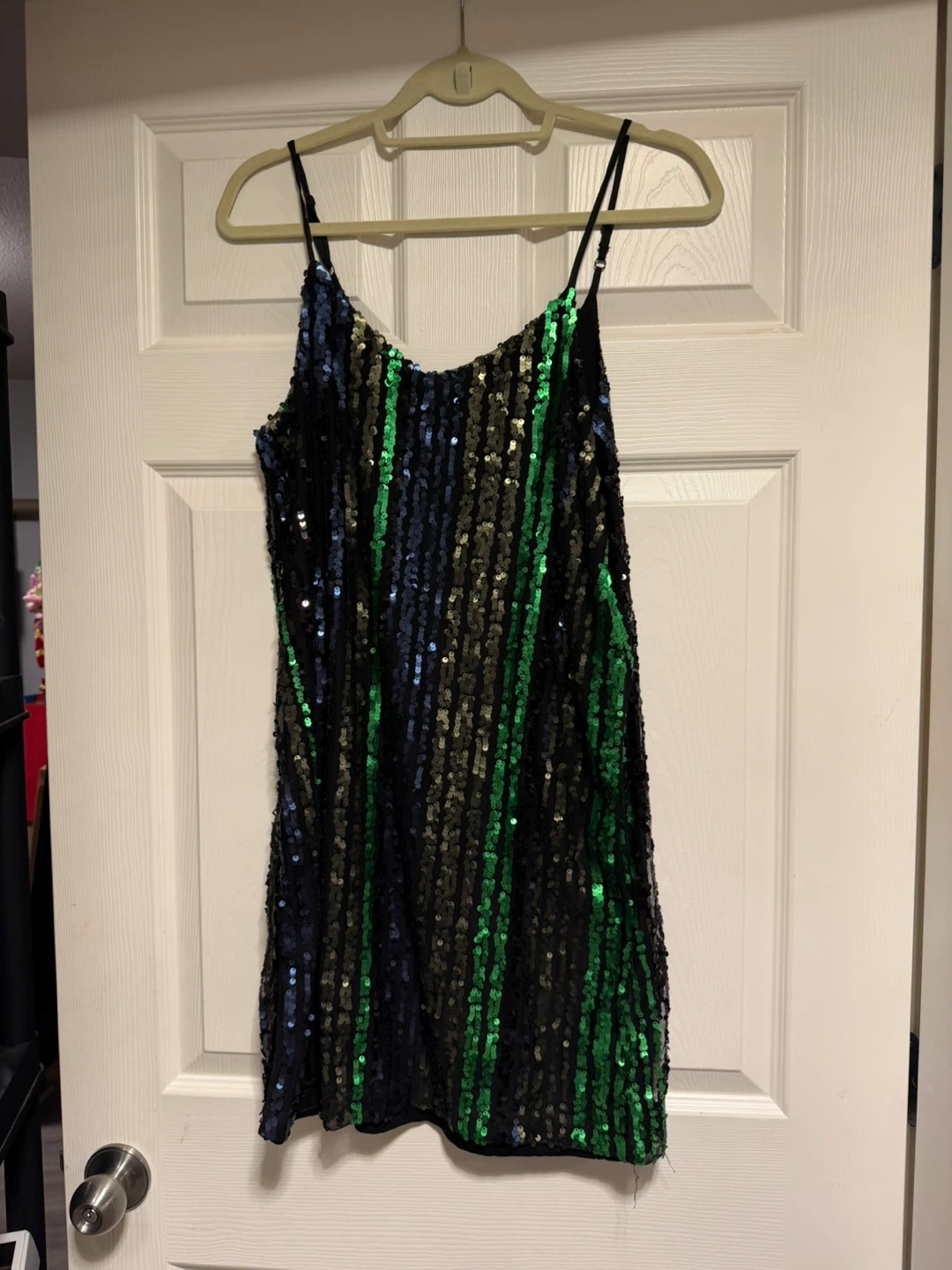 Selling a Rachel Zoe sequin mini dress in size small. It's a fun and sparkly dress, perfect for a night out! The dress features a black base with vertical stripes of blue, green, and gold sequins. It's in great condition!