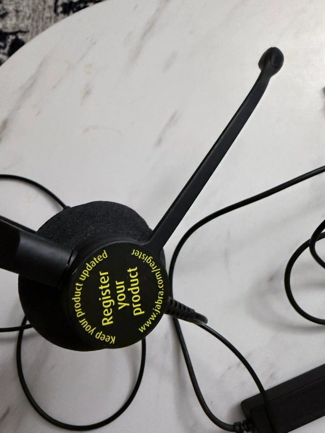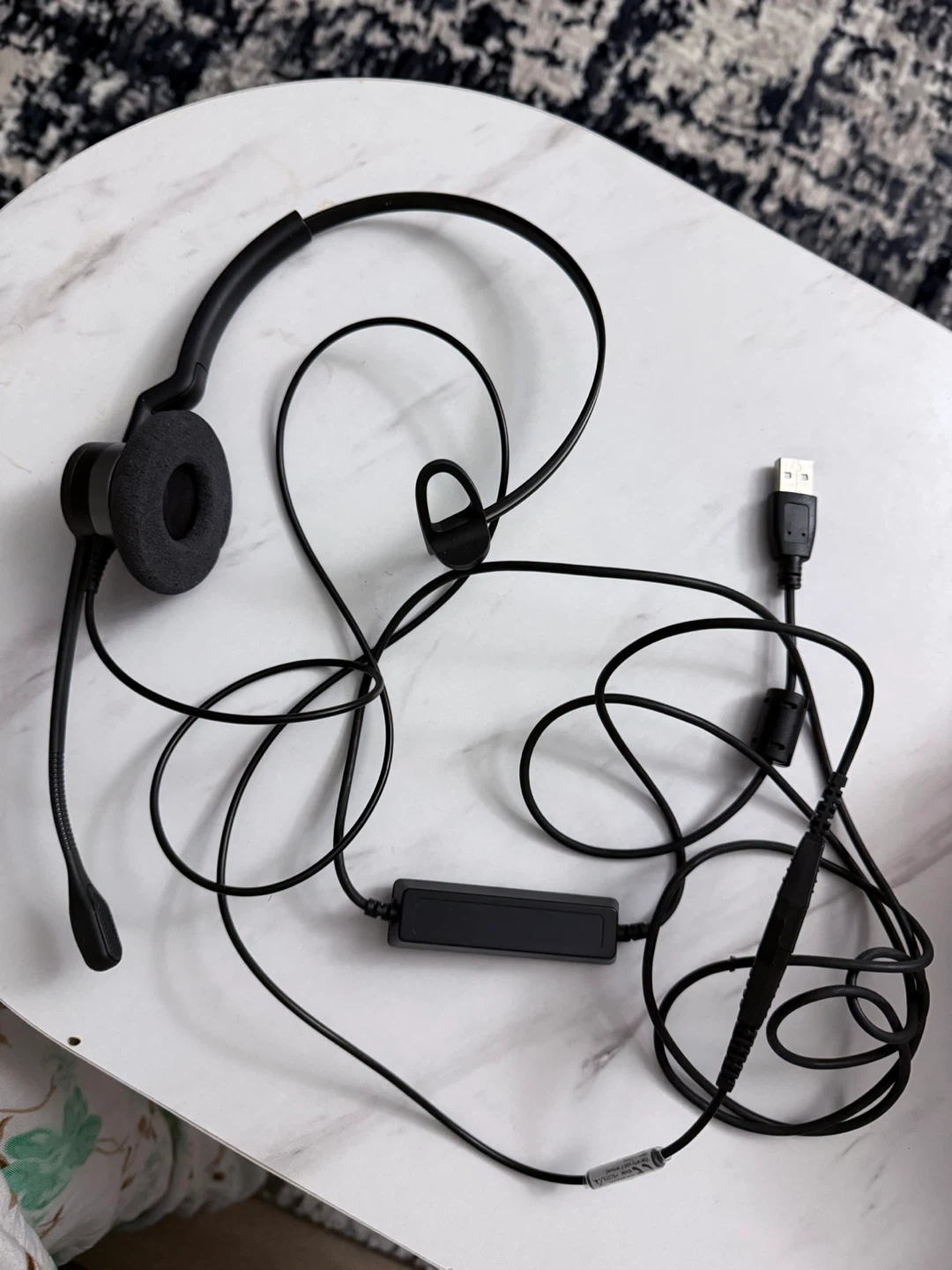 This is a Jabra headset with a flexible boom microphone. It connects via USB and has an inline volume and mute control. The ear cushion is soft and comfortable.