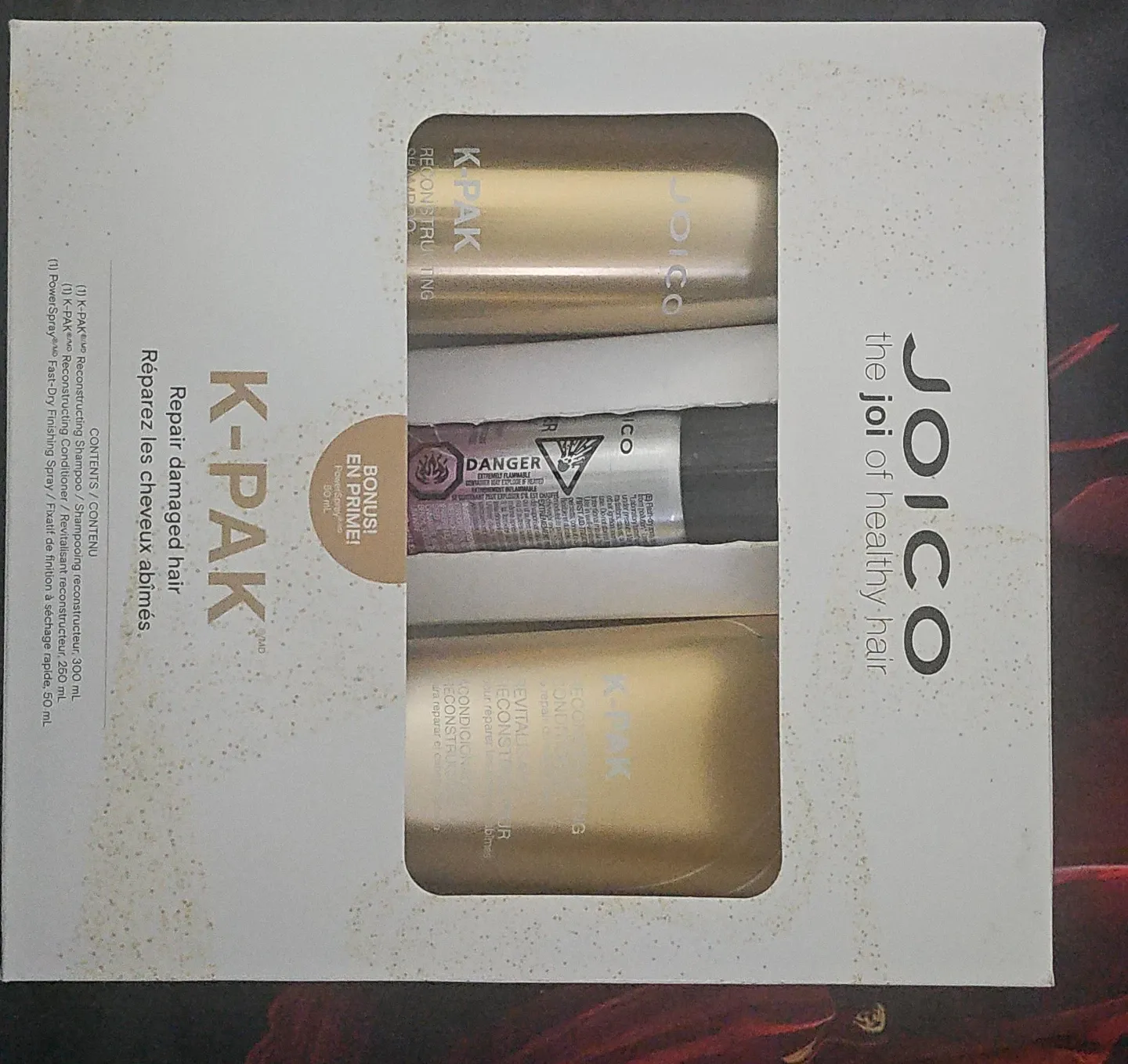This JOICO K-Pak set is designed to repair damaged hair. It includes a reconstructing shampoo (300 mL), a reconstructing conditioner (250 mL), and a bonus PowerSpray fast-dry finishing spray (50 mL).