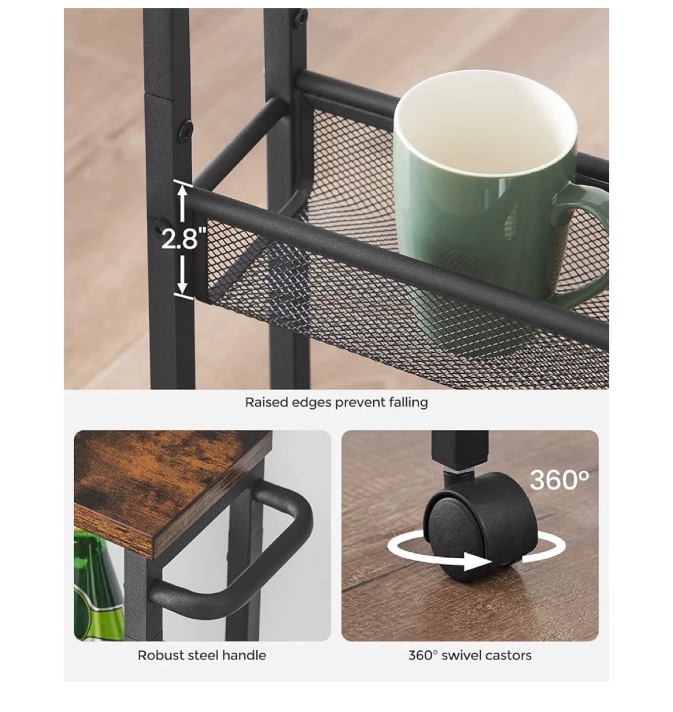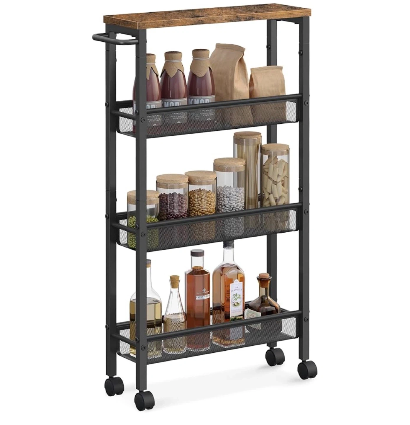 This 4-tier rolling storage cart is perfect for organizing items in tight spaces. It features a rustic wood top and mesh baskets with raised edges to prevent items from falling. The cart includes 360° swivel castors for easy mobility and a robust steel handle. Dimensions are 30.3" H x 17.9" W x 5.1" D.
