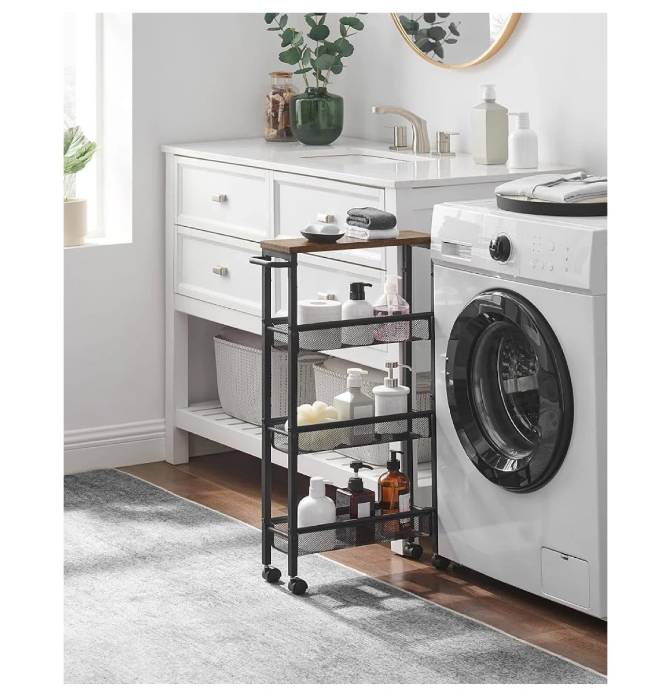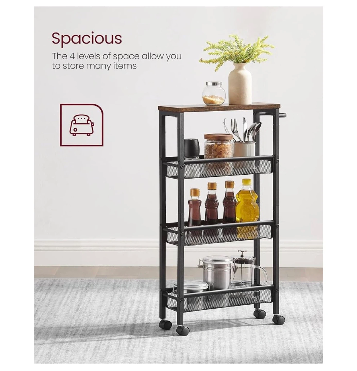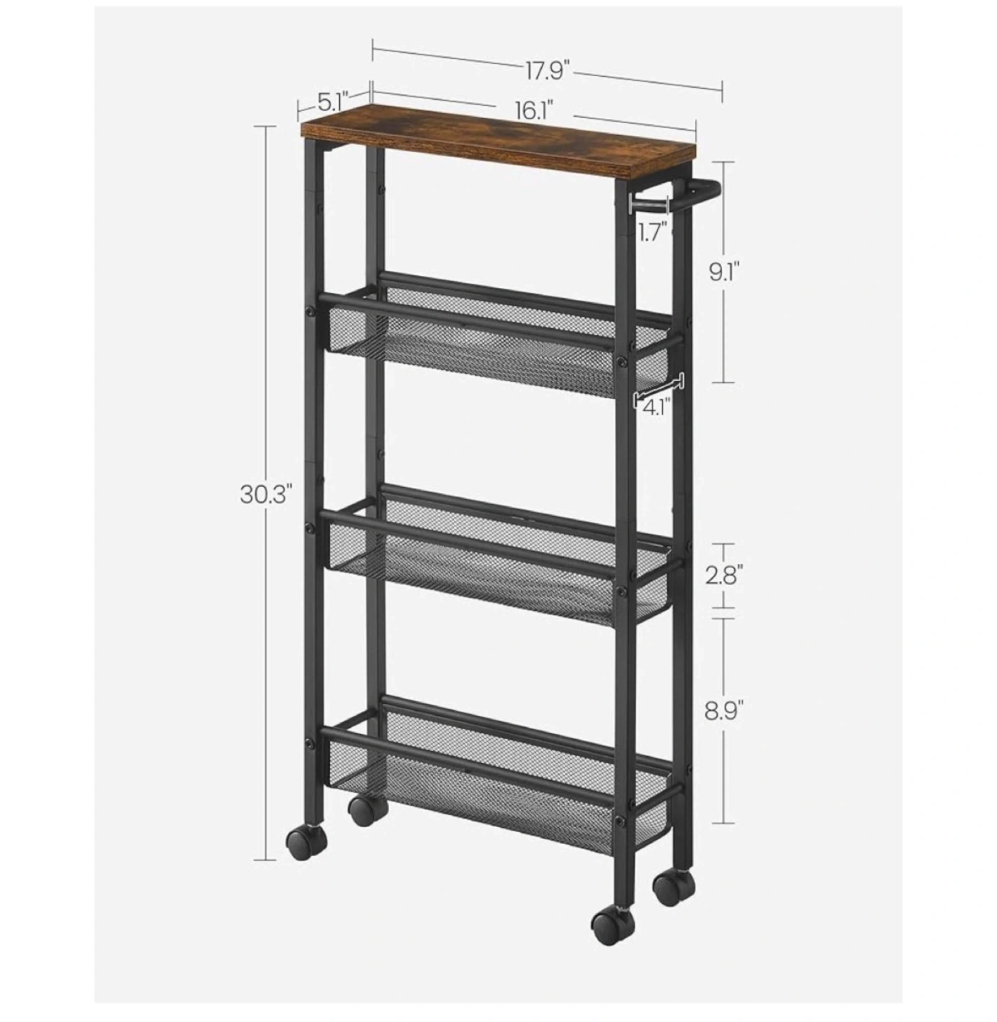 This 4-tier rolling storage cart is perfect for organizing items in tight spaces. It features a rustic wood top and mesh baskets with raised edges to prevent items from falling. The cart includes 360° swivel castors for easy mobility and a robust steel handle. Dimensions are 30.3" H x 17.9" W x 5.1" D.