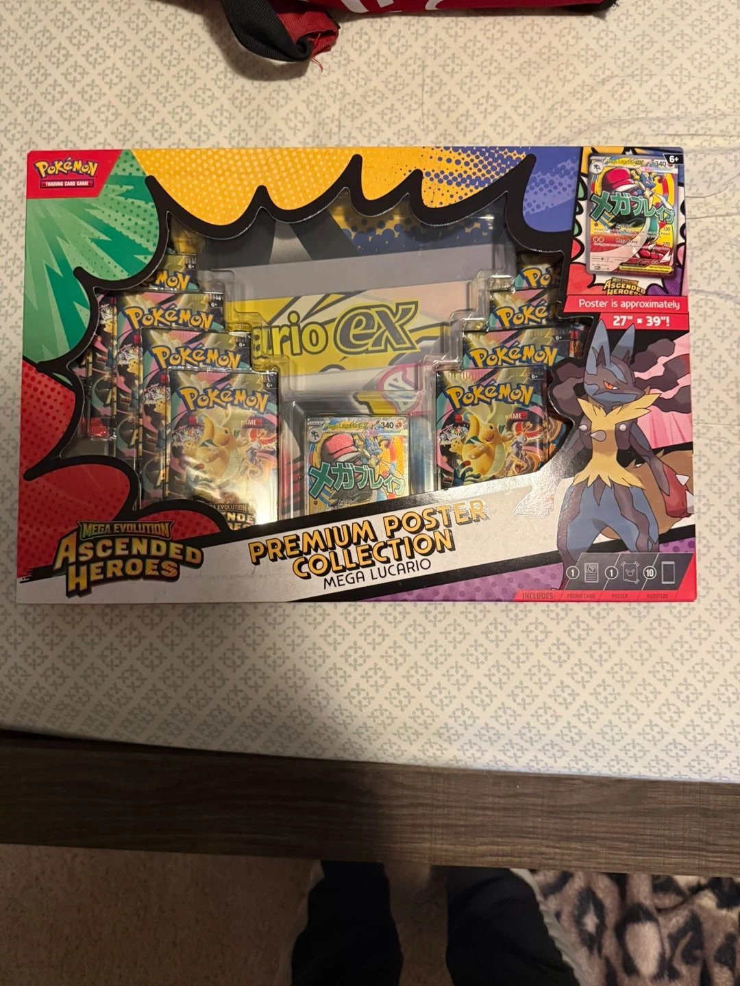 This is the Pokémon Mega Evolution Ascended Heroes Premium Poster Collection featuring Mega Lucario. It includes a promo card, a poster, and booster packs. The poster measures approximately 27" by 39"!