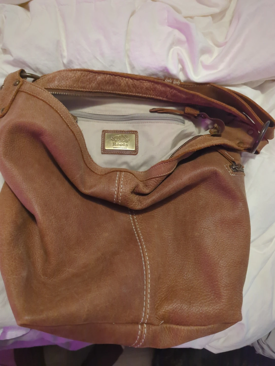 This is a brown leather shoulder bag from Roots. It features a soft, distressed leather exterior with contrast stitching. The interior has a zippered pocket.