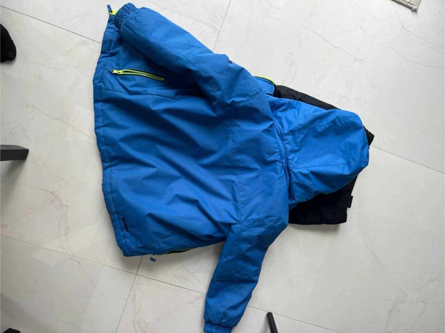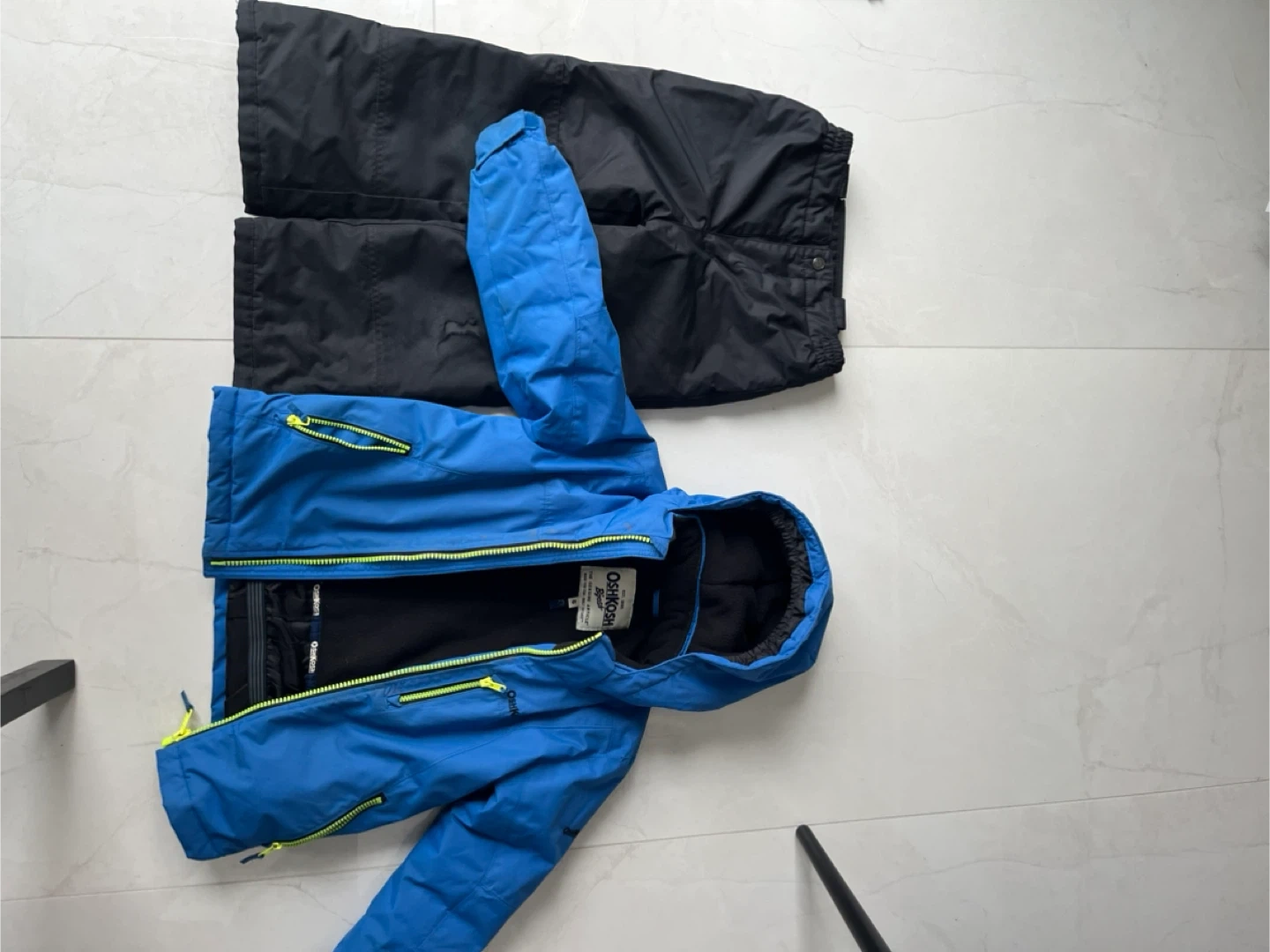 OshKosh B'gosh ski jacket and pants set for kids. Features a bright blue jacket with yellow accents and black snow pants. Size 6. Perfect for staying warm and dry during winter activities!