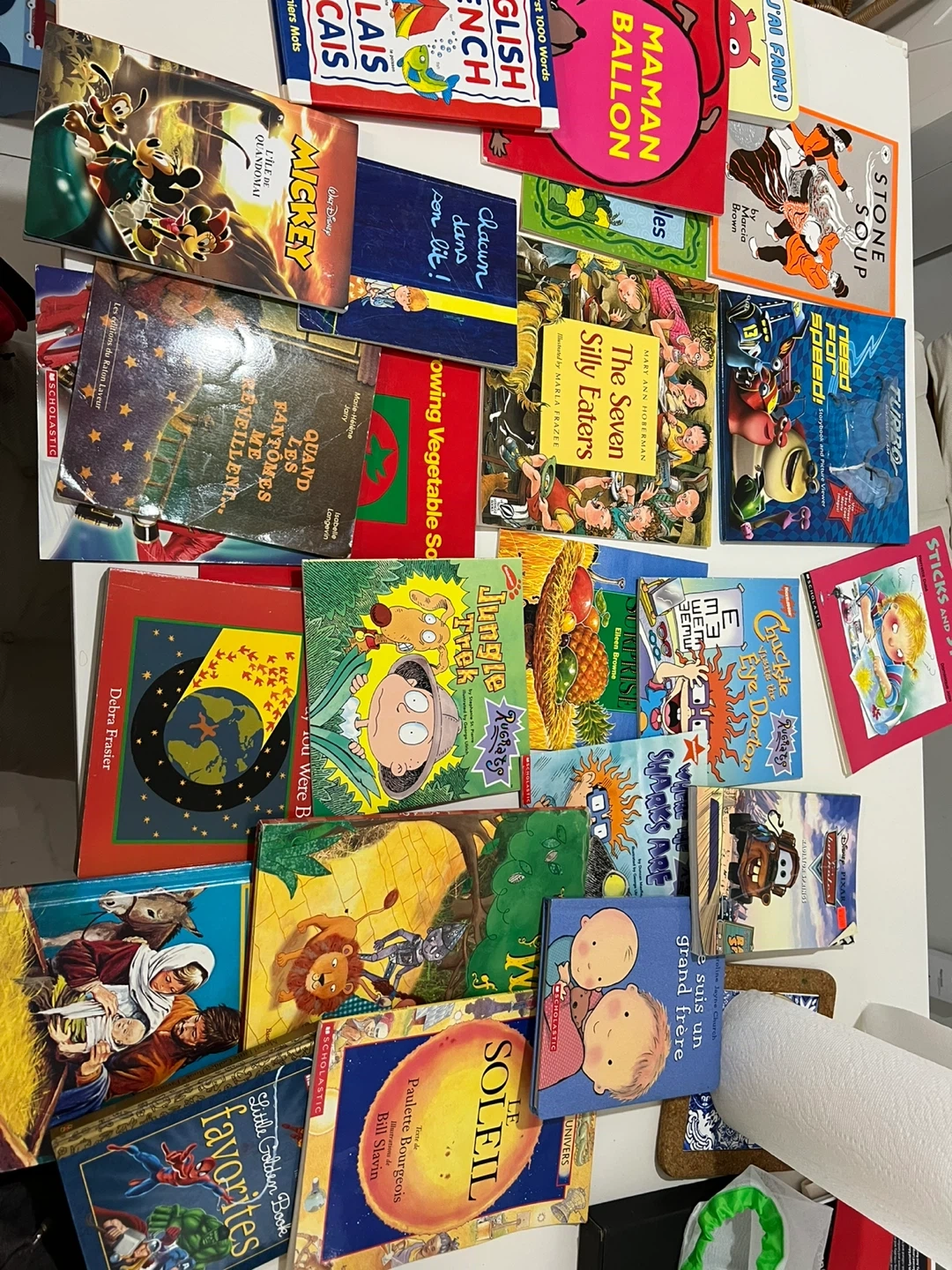 A collection of children's books including Disney's Mickey Mouse, The Seven Silly Eaters, and more. Titles range from French language learning to stories like 'Jungle Ruste' and 'Stone Soup'. This set is great for young readers exploring different stories and languages. Some books in French and others in English