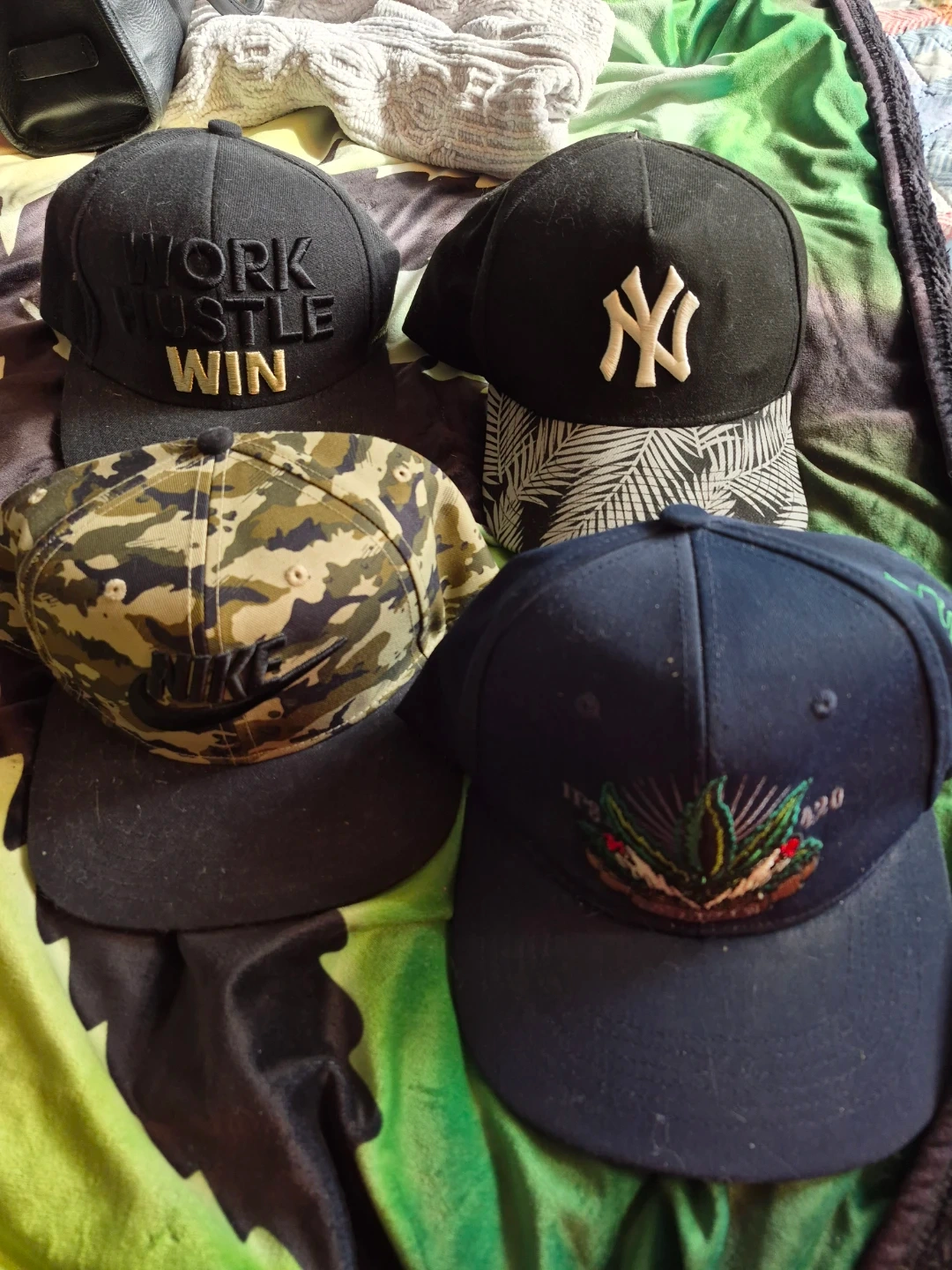 Four baseball caps: one black with 'Work Hustle Win', one black New York Yankees, one camouflage Nike, and one navy blue with graphic embroidery. Various styles and brands.