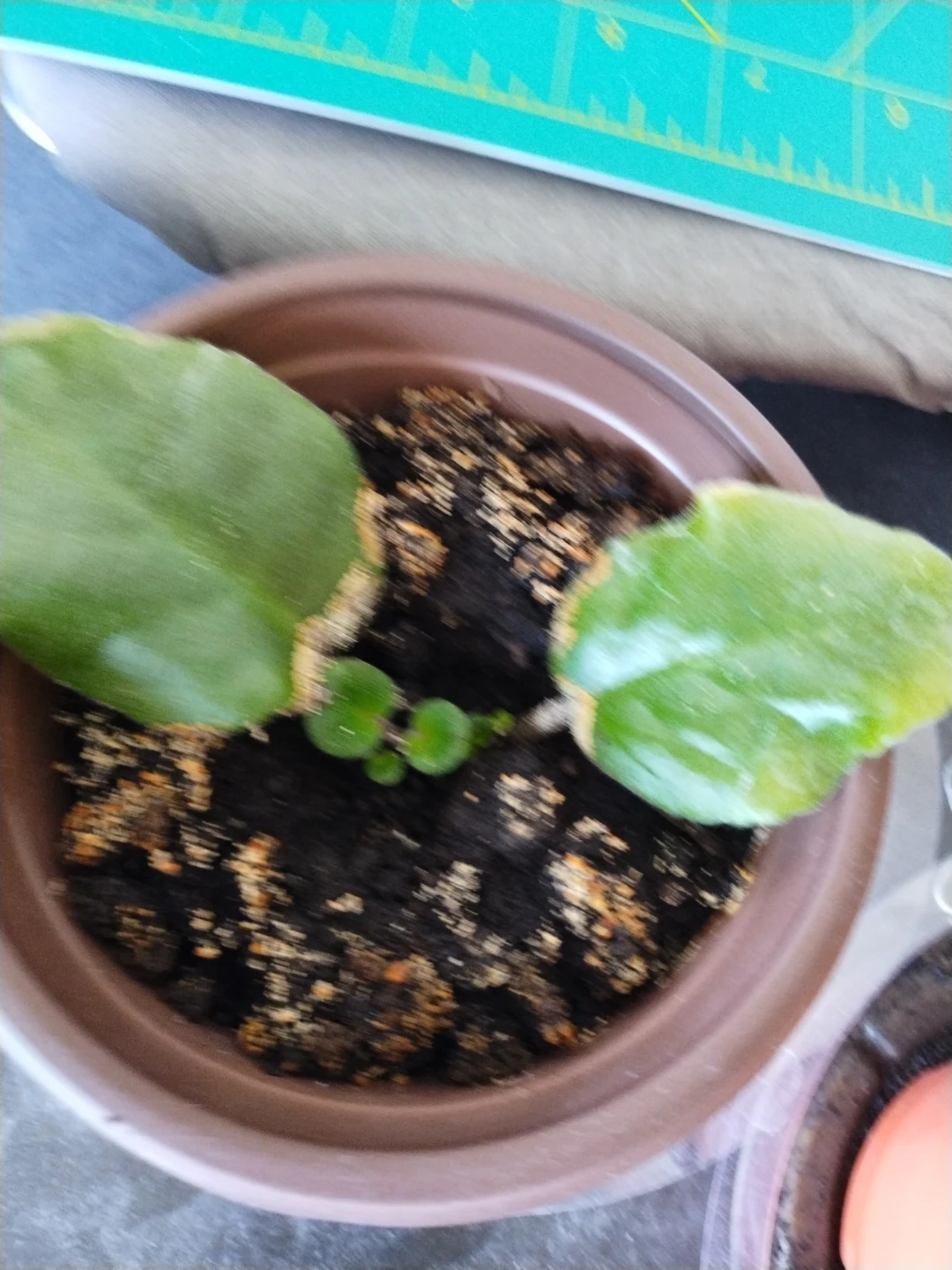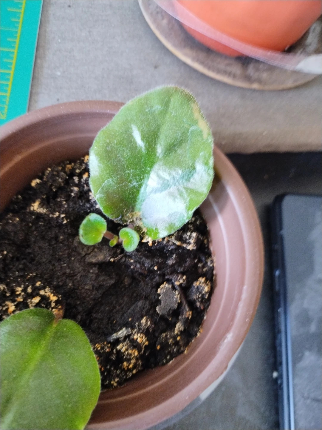 Two plant cuttings are potted in soil. One cutting has multiple leaves and new growth. The other cutting shows a larger leaf with some white marks and two small sprouts. Ready for your garden! Two African violet plants just starting to grow