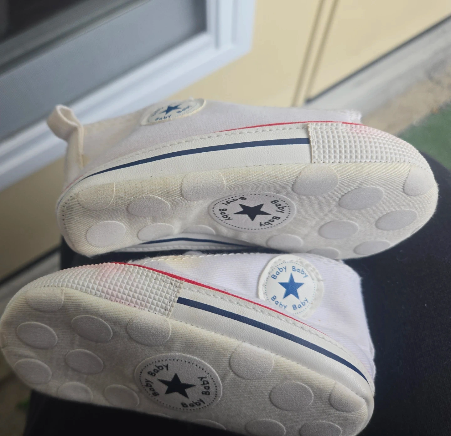 White canvas high-top baby shoes with red and blue accents. Elastic laces and hook-and-loop closure for easy on and off. Size 3 indicated inside.