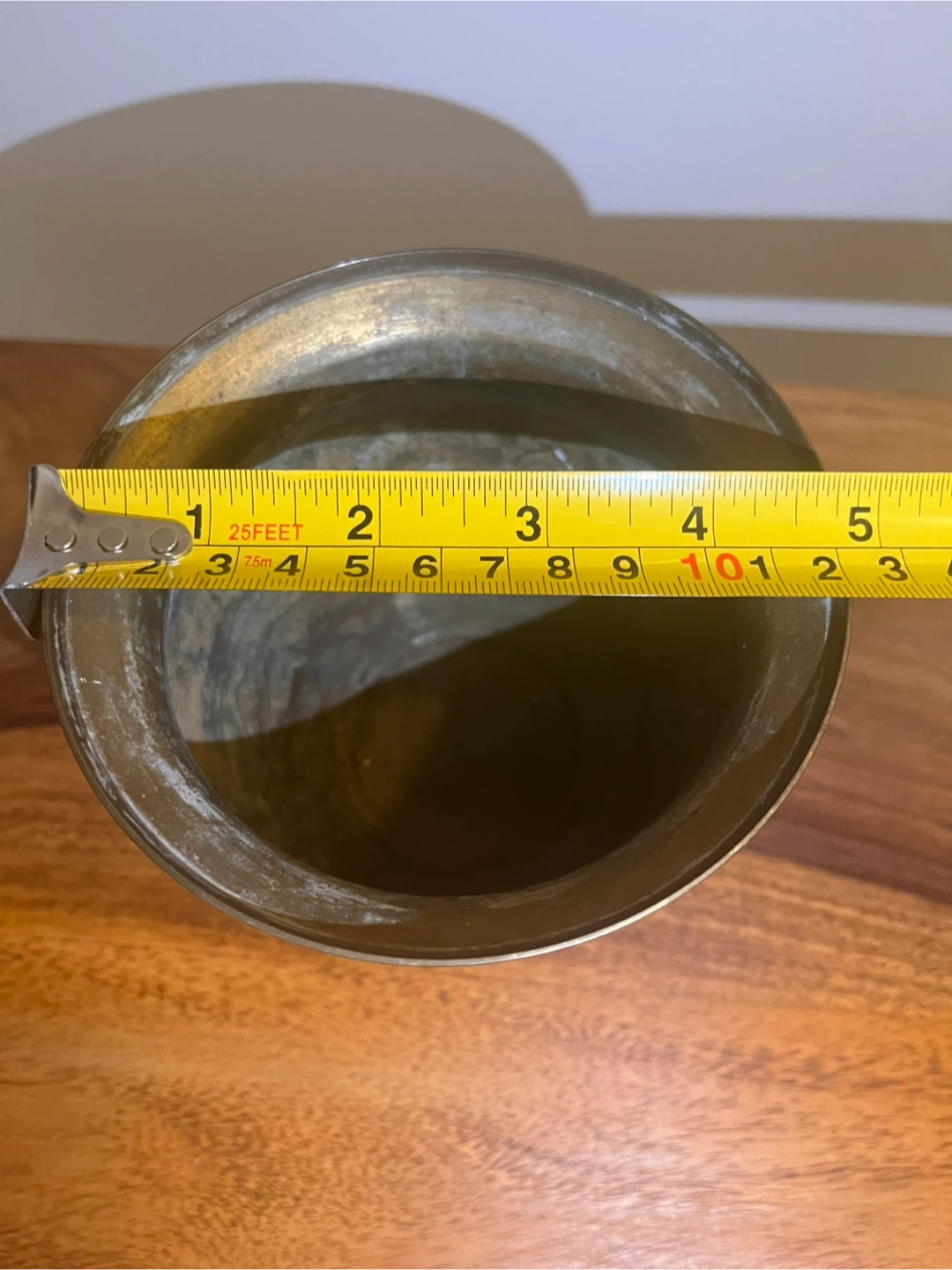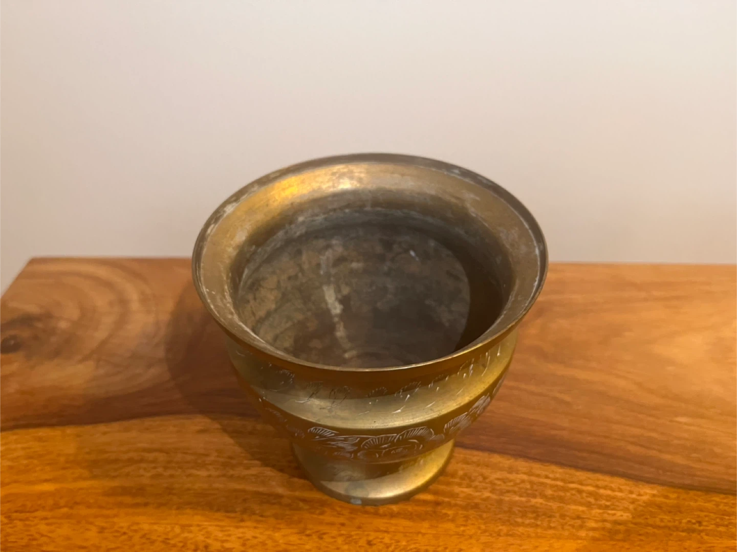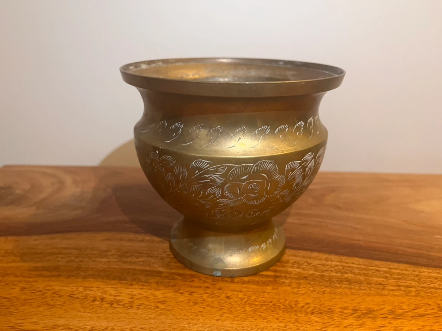 This is a decorative brass pot with intricate floral engravings. It measures approximately 5 inches tall and 4 inches in diameter. This pot would be lovely for small plants or as a decorative accent piece.