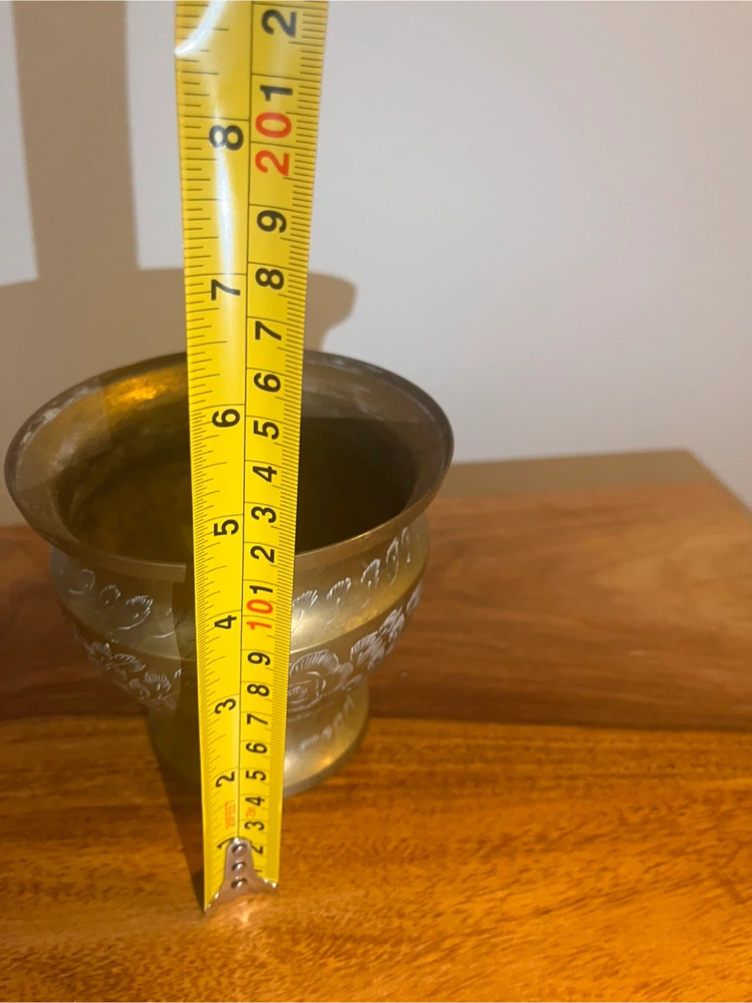 This is a decorative brass pot with intricate floral engravings. It measures approximately 5 inches tall and 4 inches in diameter. This pot would be lovely for small plants or as a decorative accent piece.