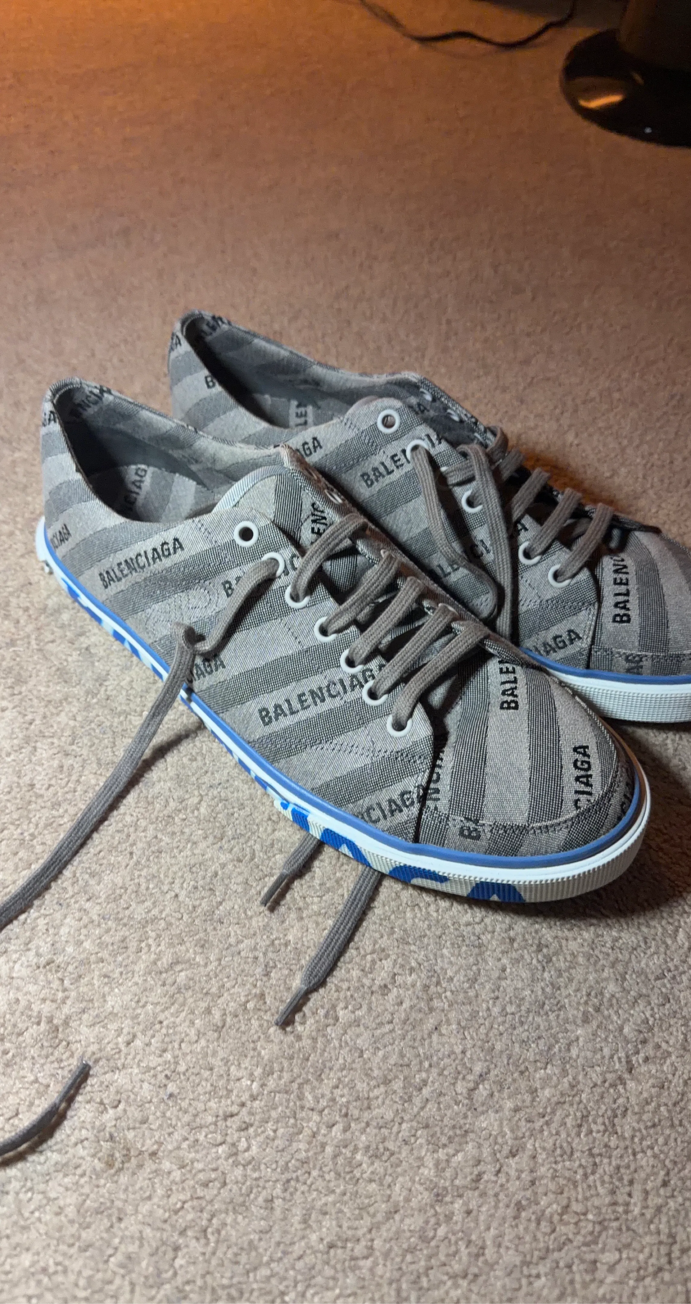 Grey and black Balenciaga sneakers with a striped pattern and all-over logo print. Canvas upper and lace-up closure. These shoes are designed for casual wear. Never been used