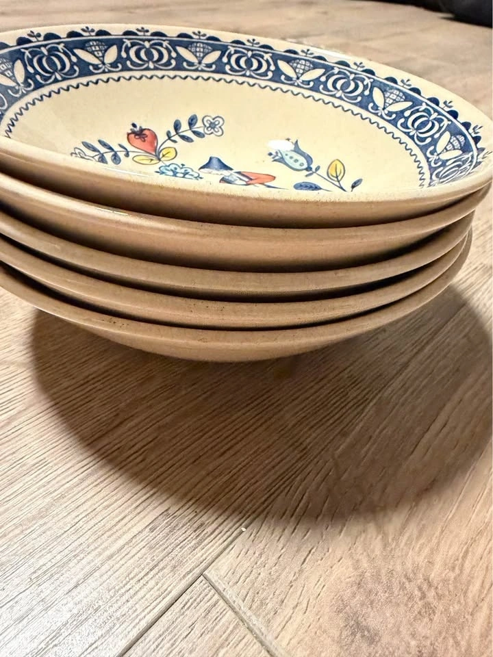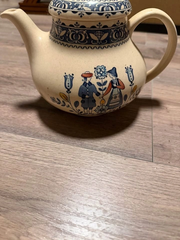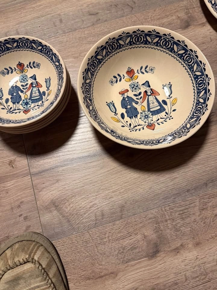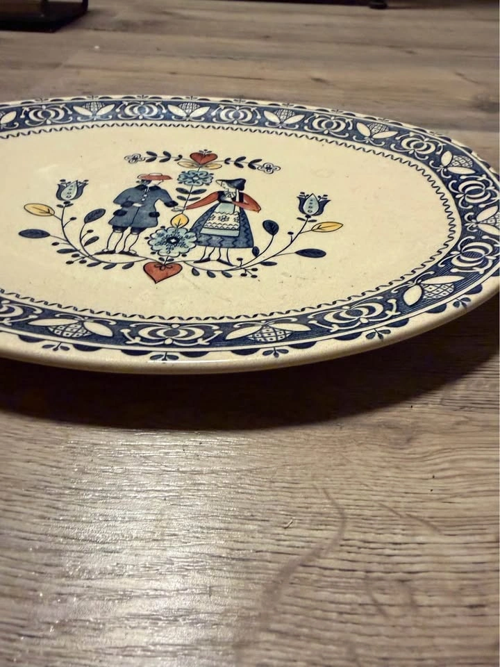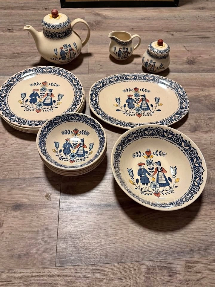 This is a collection of vintage Johnson Brothers "Hearts and Flowers" ironstone dinnerware. The pattern, produced from the 1970s to 1980s, features a Delft-inspired design with a folk art style illustration of a couple in traditional dress. The set includes various pieces such as a teapot, creamer, lidded sugar bowl, 5 dinner plates, an oval serving platter, and 5 soup bowls and a serving bowl. Made in England. Feel free to message if you have any questions!