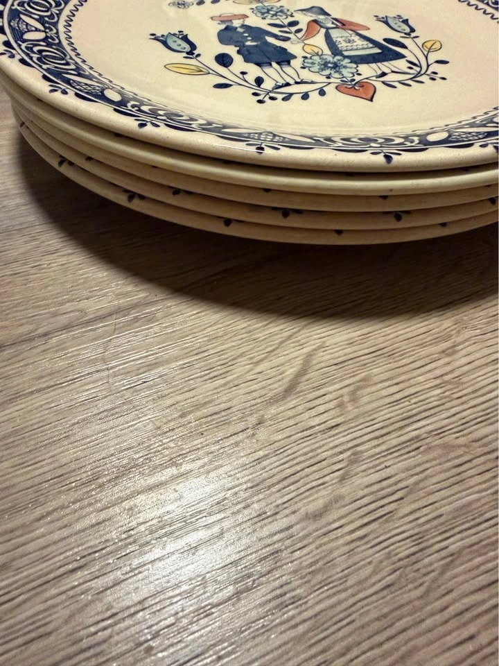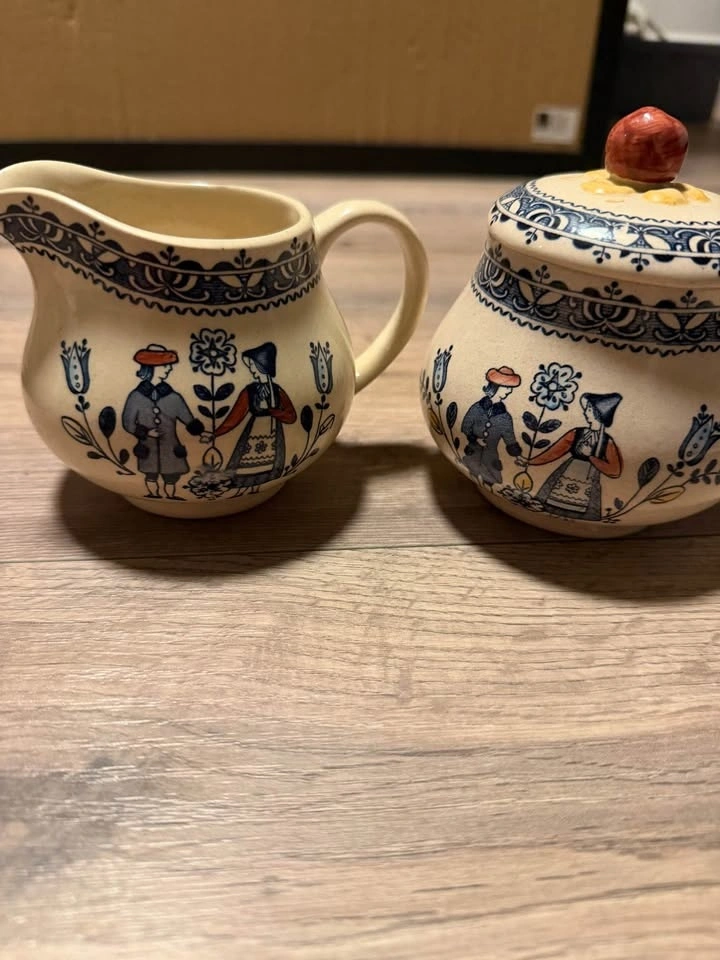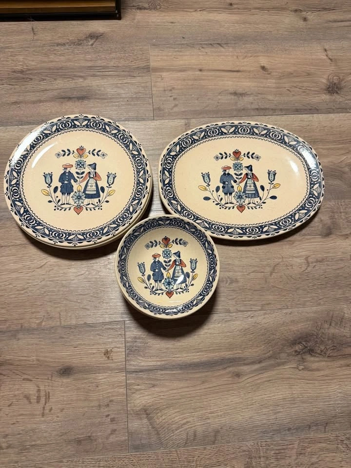 This is a collection of vintage Johnson Brothers "Hearts and Flowers" ironstone dinnerware. The pattern, produced from the 1970s to 1980s, features a Delft-inspired design with a folk art style illustration of a couple in traditional dress. The set includes various pieces such as a teapot, creamer, lidded sugar bowl, 5 dinner plates, an oval serving platter, and 5 soup bowls and a serving bowl. Made in England. Feel free to message if you have any questions!