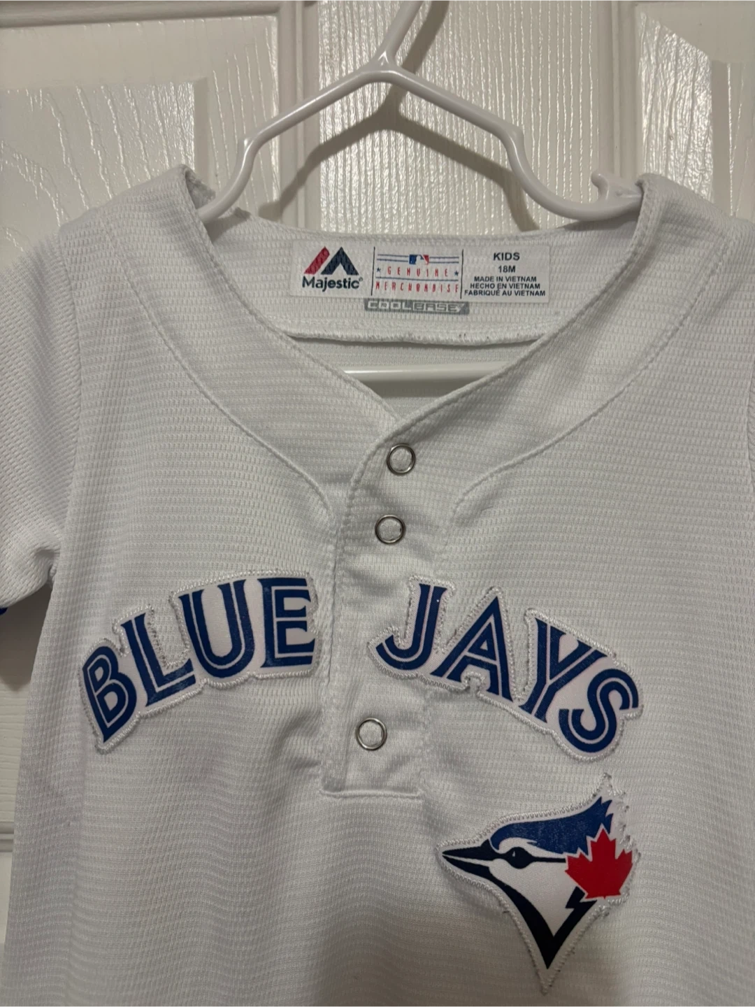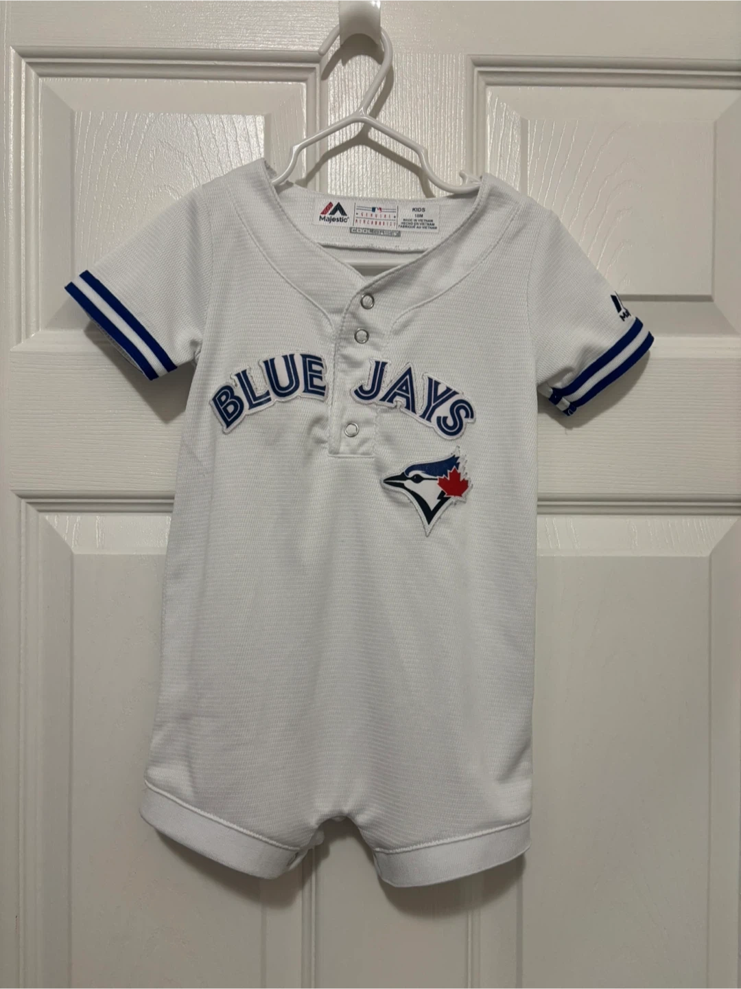 Majestic brand Toronto Blue Jays baseball romper for kids. White with blue lettering and team logo. Size 18 months. Perfect for little baseball fans!