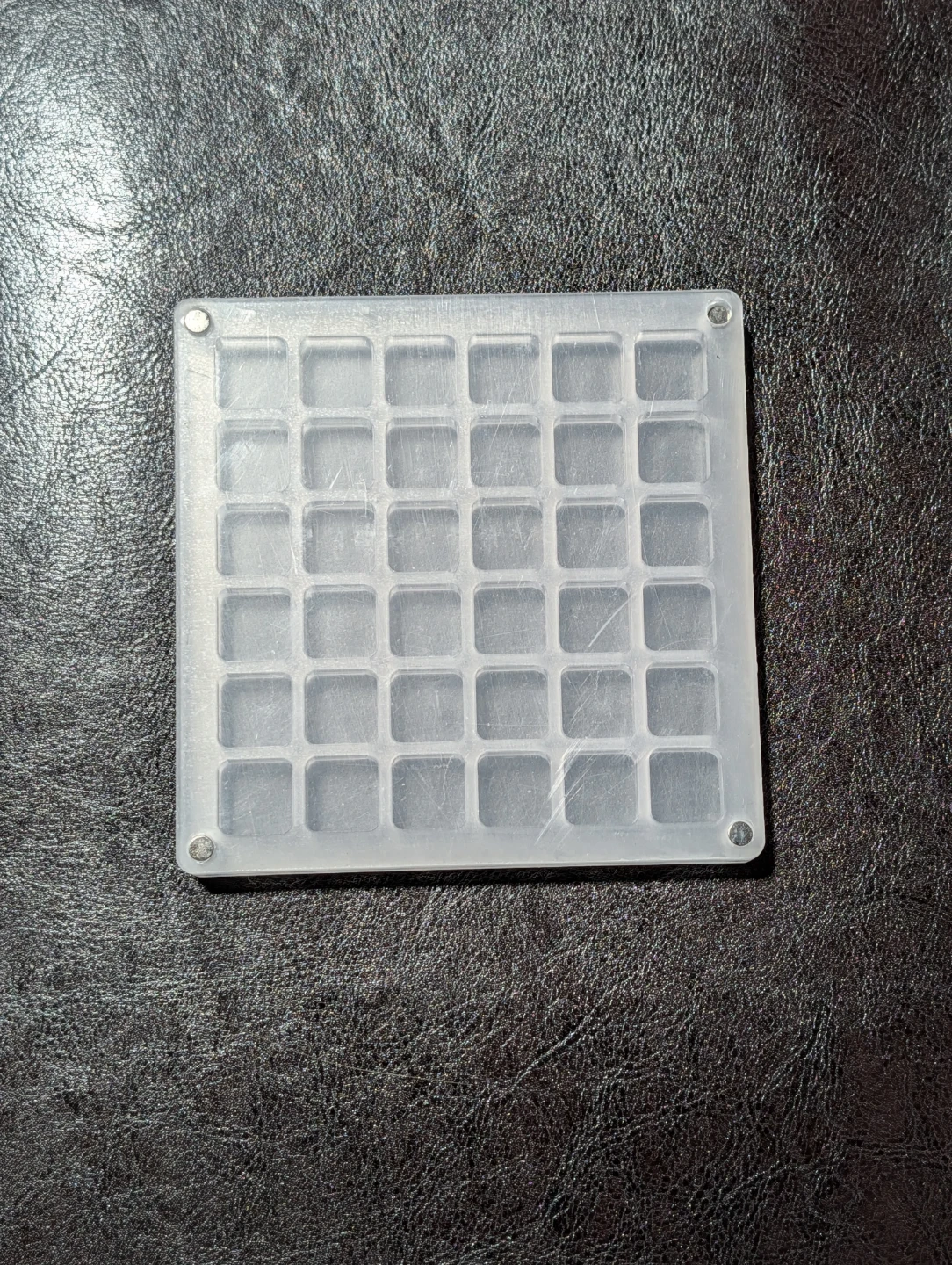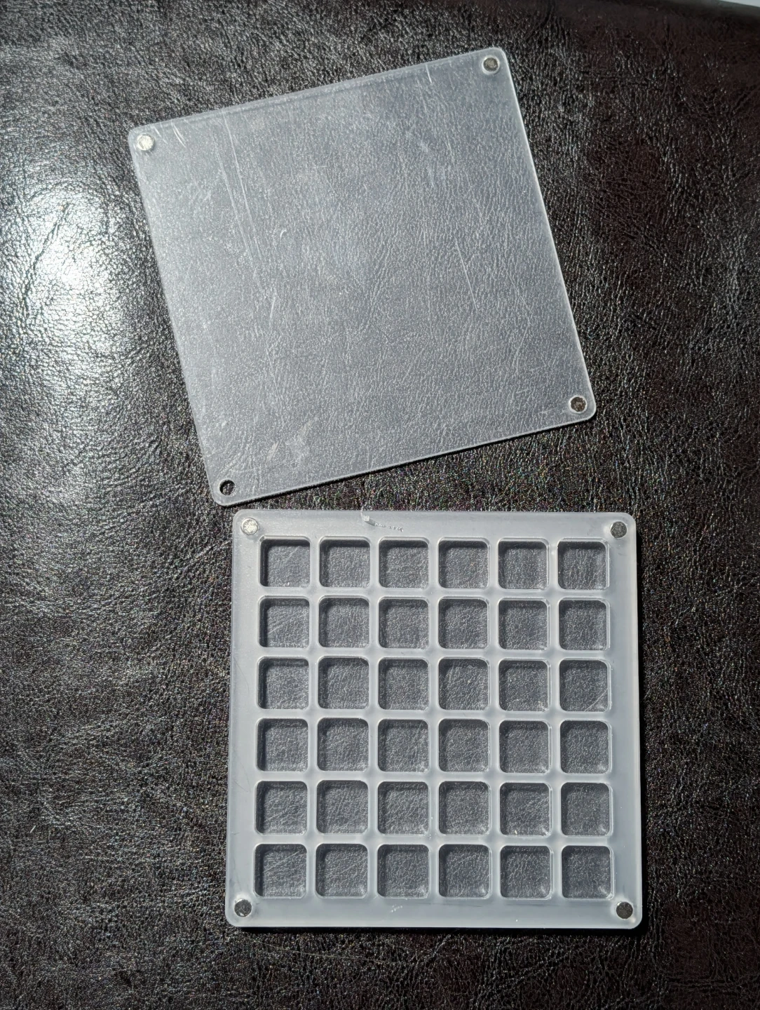 This is a two-piece plastic tray with 36 individual square compartments. The lid fits securely over the base. It's made of a translucent white plastic. Perfect for organizing small items or crafts!